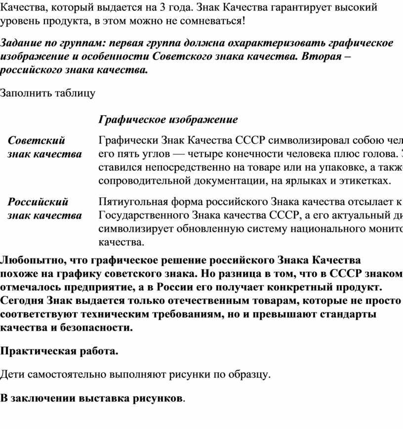 Задание по группам: первая группа должна охарактеризовать графическое изображение и особенности Советского знака качества. Вторая – российского знака качества.