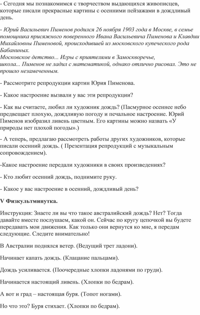 -дать представление о многообразии форм изображения дождя живописцами. Юрия Пименова и Франса Мазареля;