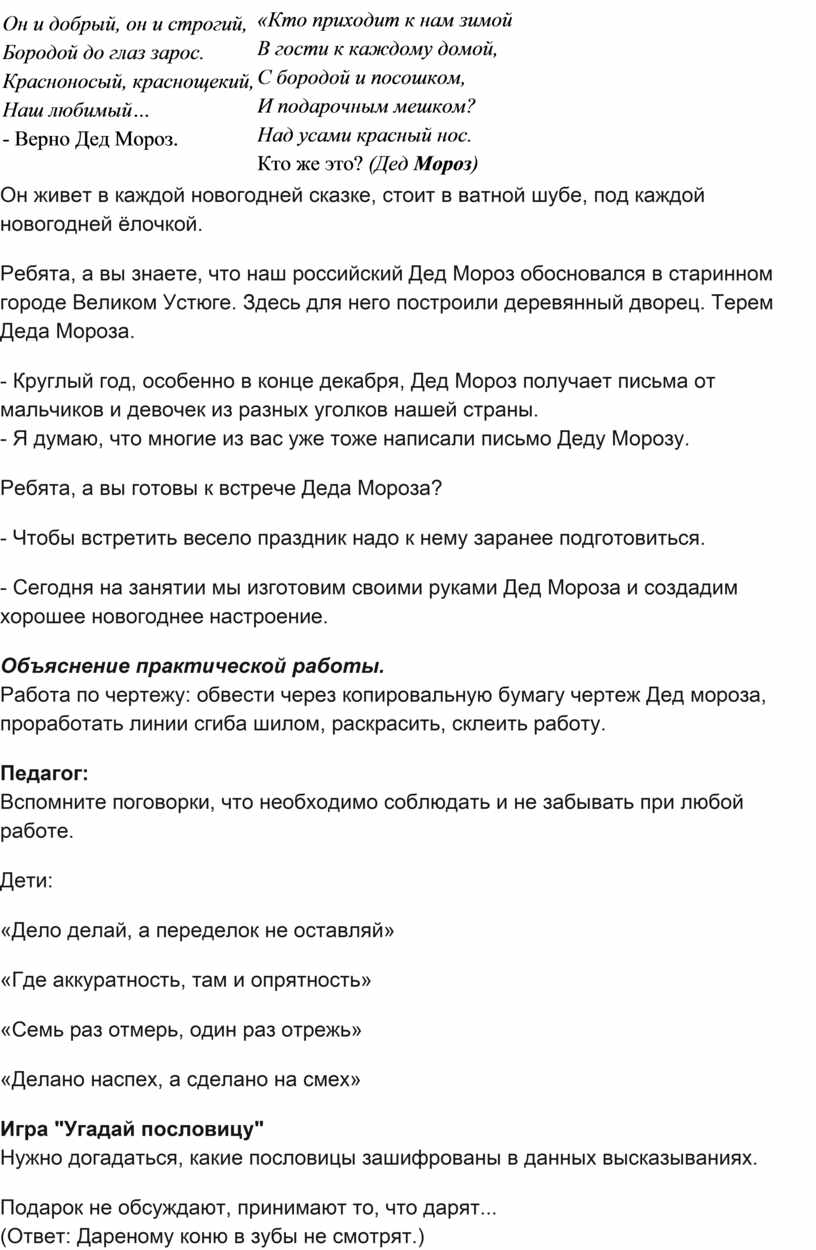 Работа по чертежу: обвести через копировальную бумагу чертеж Дед мороза, проработать линии сгиба шилом, раскрасить, склеить работу.