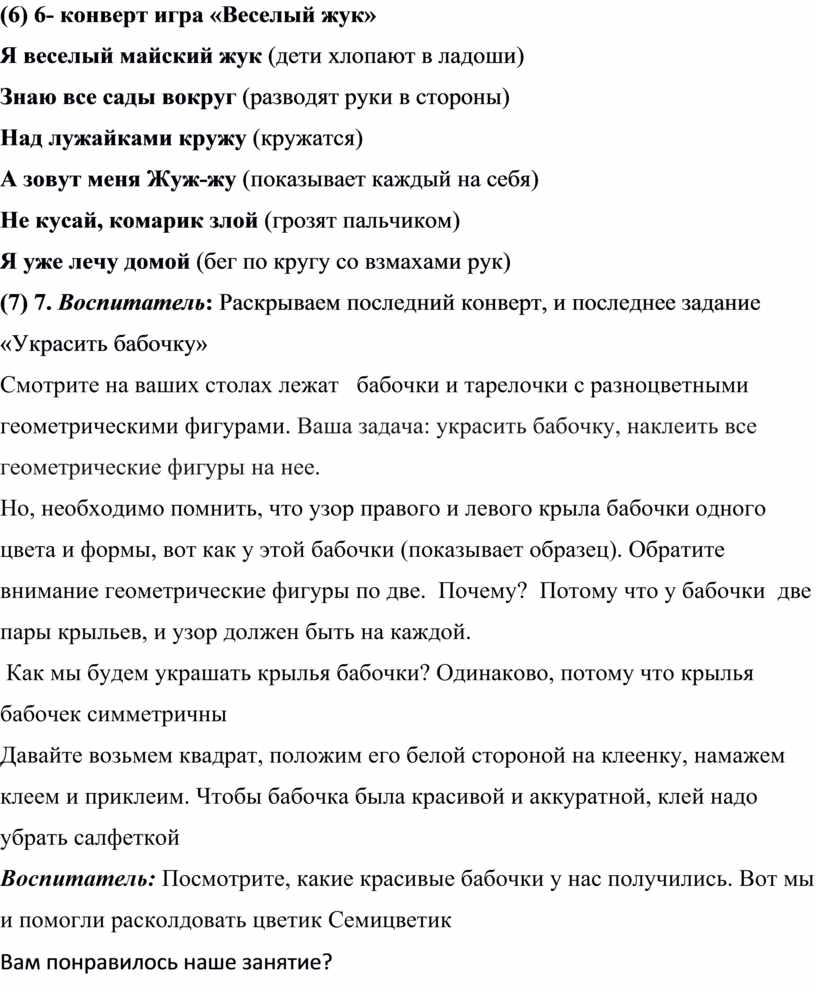Воспитатель: Посмотрите, какие красивые бабочки у нас получились. Вот мы и помогли расколдовать цветик Семицветик