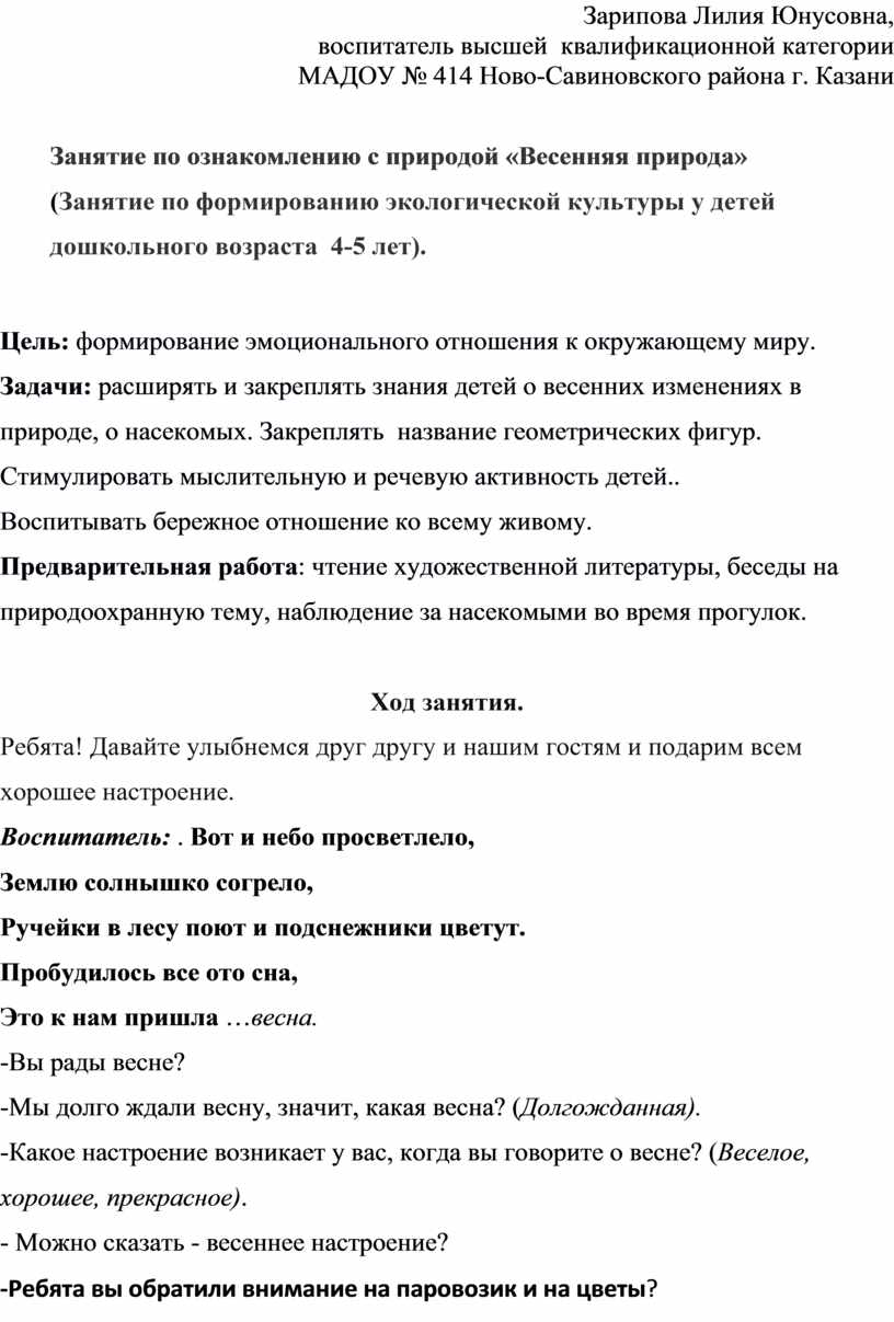 Задачи: расширять и закреплять знания детей о весенних изменениях в природе, о насекомых. Закреплять название геометрических фигур. Стимулировать мыслительную и речевую активность детей..