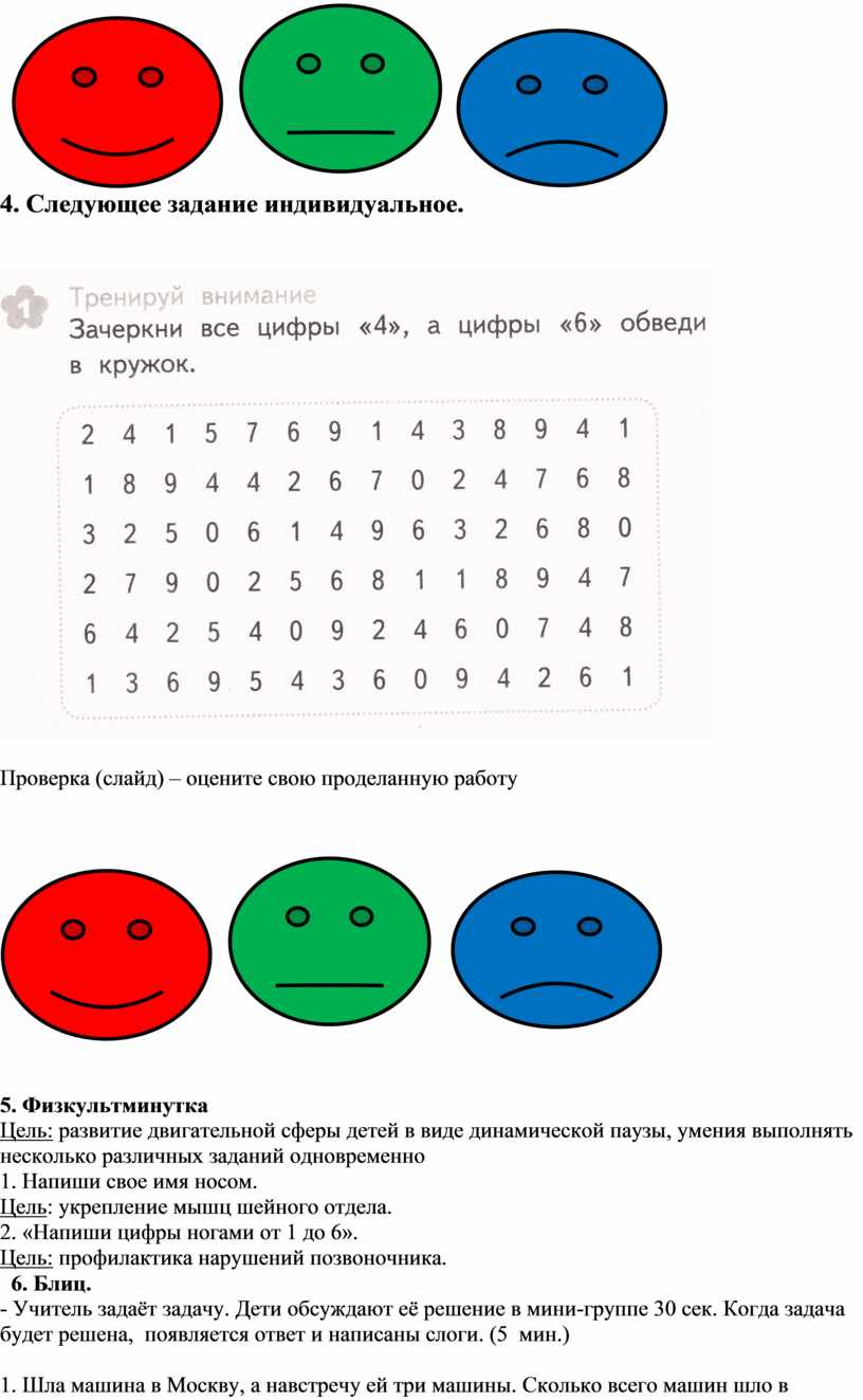Цель: включение детей в работу, подготовка их к активной учебно-познавательной деятельности на протяжении всего занятия; развитие сообразительности, быстроты реакции.