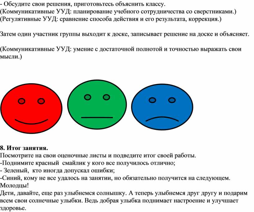 У вас на столе лежат оценочные листы. Вы должны оценить свою работу на протяжжении всего занятия и аждого этапа урока смайликами.
