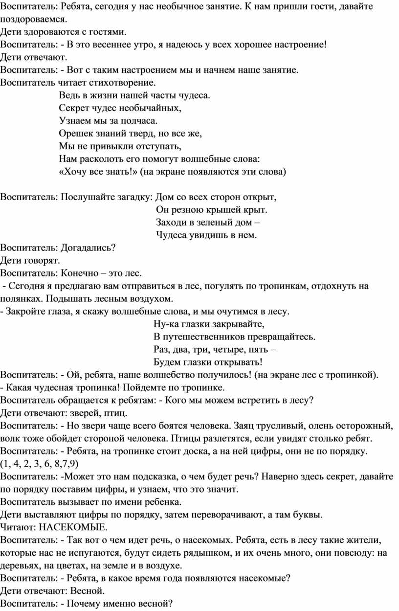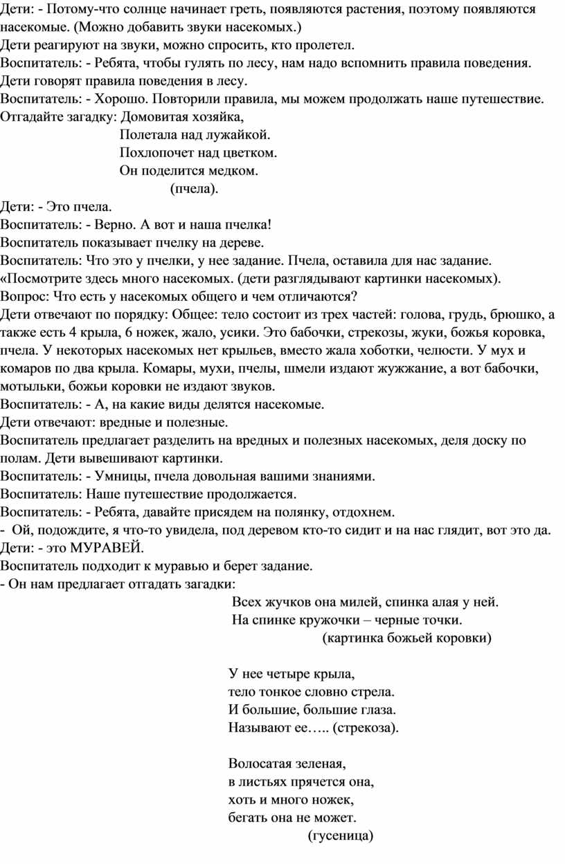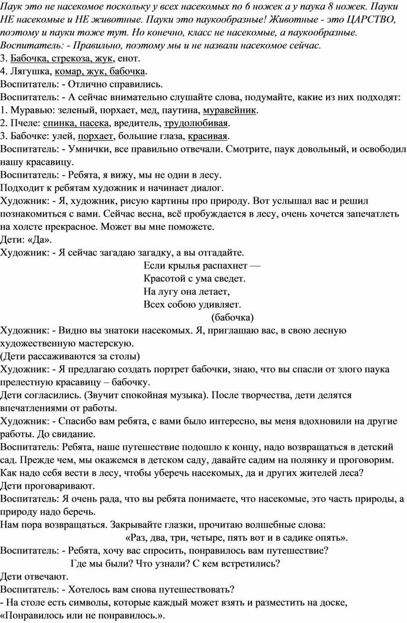 Воспитатель: - Так вот о чем идет речь, о насекомых. Ребята, есть в лесу такие жители, которые нас не испугаются, будут сидеть рядышком, и их очень много, они повсюду: на деревьях, на цветах, на земле и в воздухе.