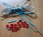 а) склеиваем между собой отдельно по цвету полоски разных цветов (красный, оранжевый, жёлтый, голубой, серый) шириной 0,5 см, длиной 30 см.;