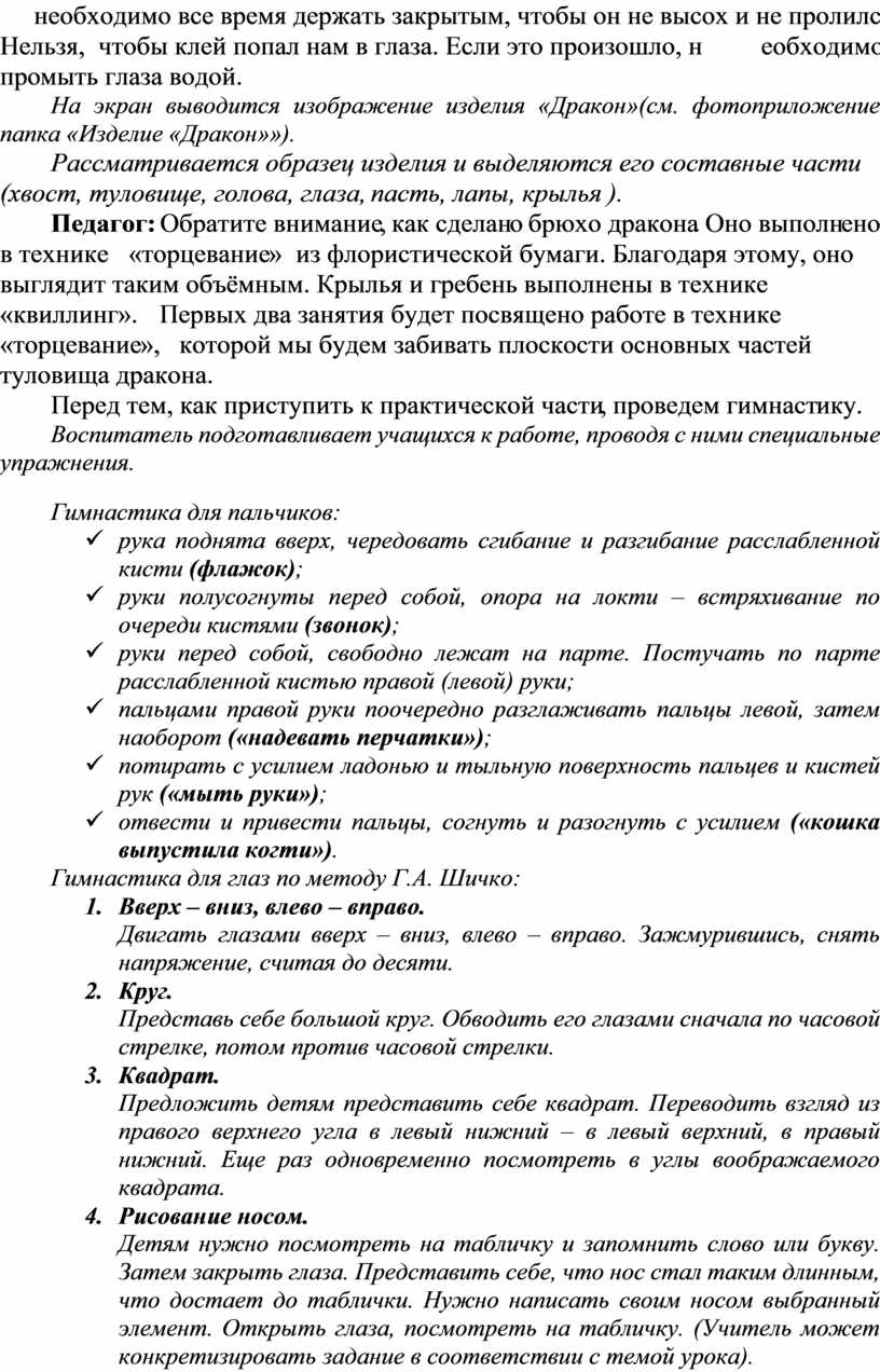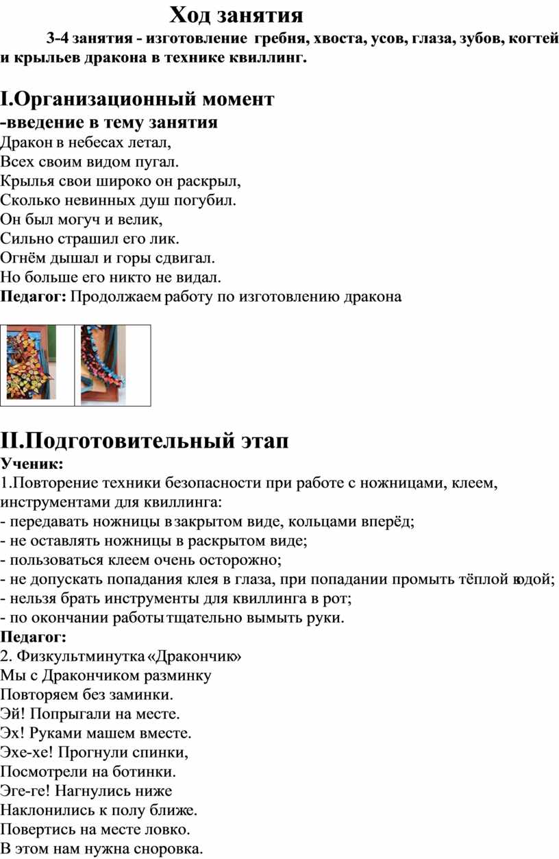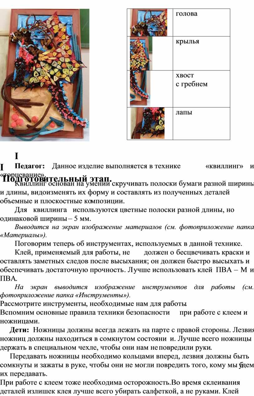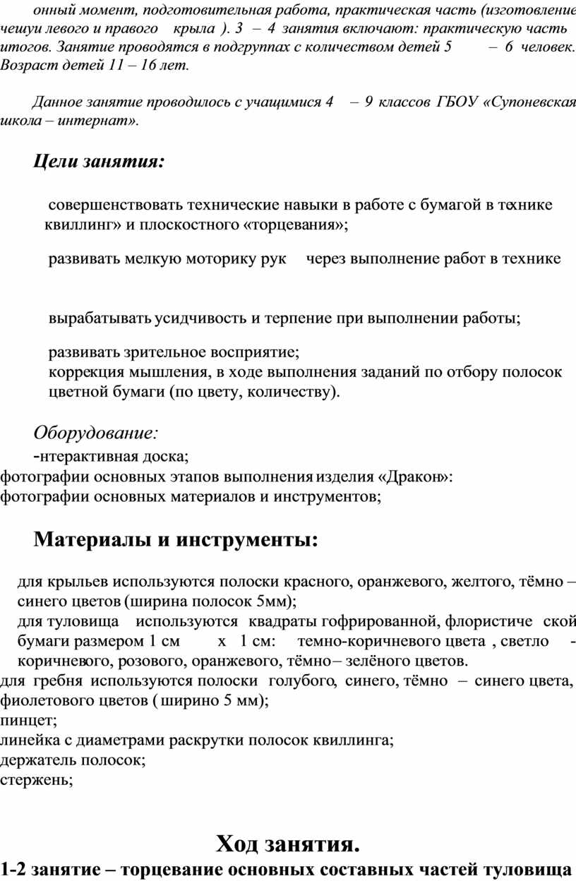 (Данная тема проекта рассчитана на 4 занятия по ручной умелости. Продолжительность одного занятия 40 минут. Время работы сочетается с кратковременным отдыхом детей (проведение физкультминуток). Используется метод синхронной работы. 1 – 2 занятия включают в себя основные этапы: организационный момент, подготовительная работа, практическая часть (изготовление чешуи левого и правого крыла ). 3 – 4 занятия включают: практическую часть (изготовление туловища «Дракона» и сборка частей тела «Дракона») и подведение итогов. Занятие проводятся в подгруппах с количеством детей 5 – 6 человек. Возраст детей 11 – 16 лет.