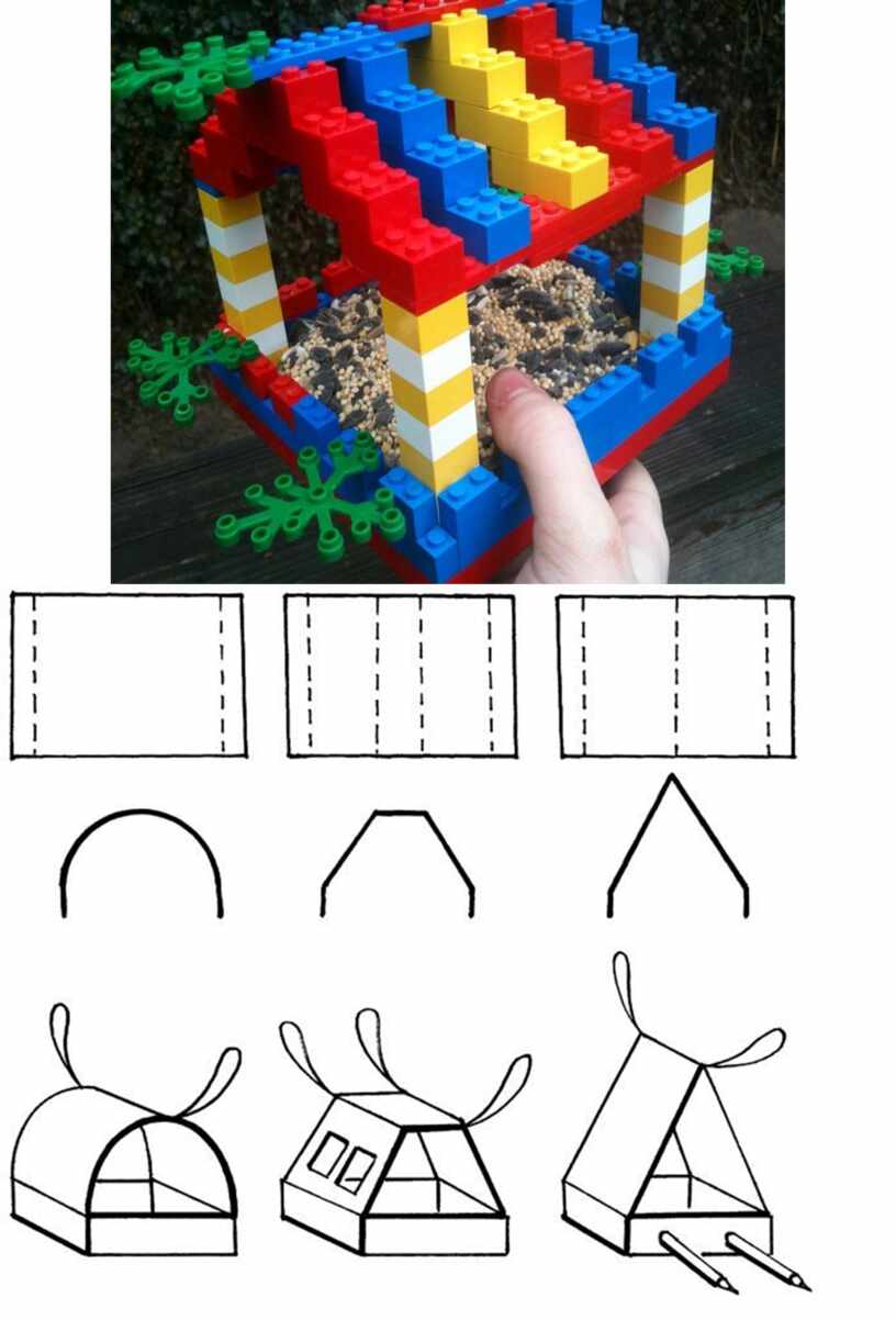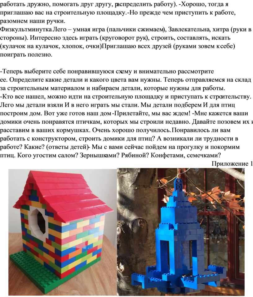 -Кто все нашел, можно идти на строительную площадку и приступать к строительству. Лего мы детали взяли И в него играть мы стали. Мы детали подберем И для птиц построим дом. Вот уже готов наш дом -Прилетайте, мы вас ждем! -Мне кажется ваши домики очень понравятся птичкам, которых мы строили недавно. Давайте позовем их и расставим в ваших кормушках. Очень хорошо получилось. Понравилось ли вам работать с конструктором, строить домики для птиц? А возникали ли трудности в работе? Какие? (ответы детей)- Мы с вами сейчас пойдем на прогулку и покормим птиц. Кого угостим салом? Зернышками? Рябиной? Конфетами, семечками?