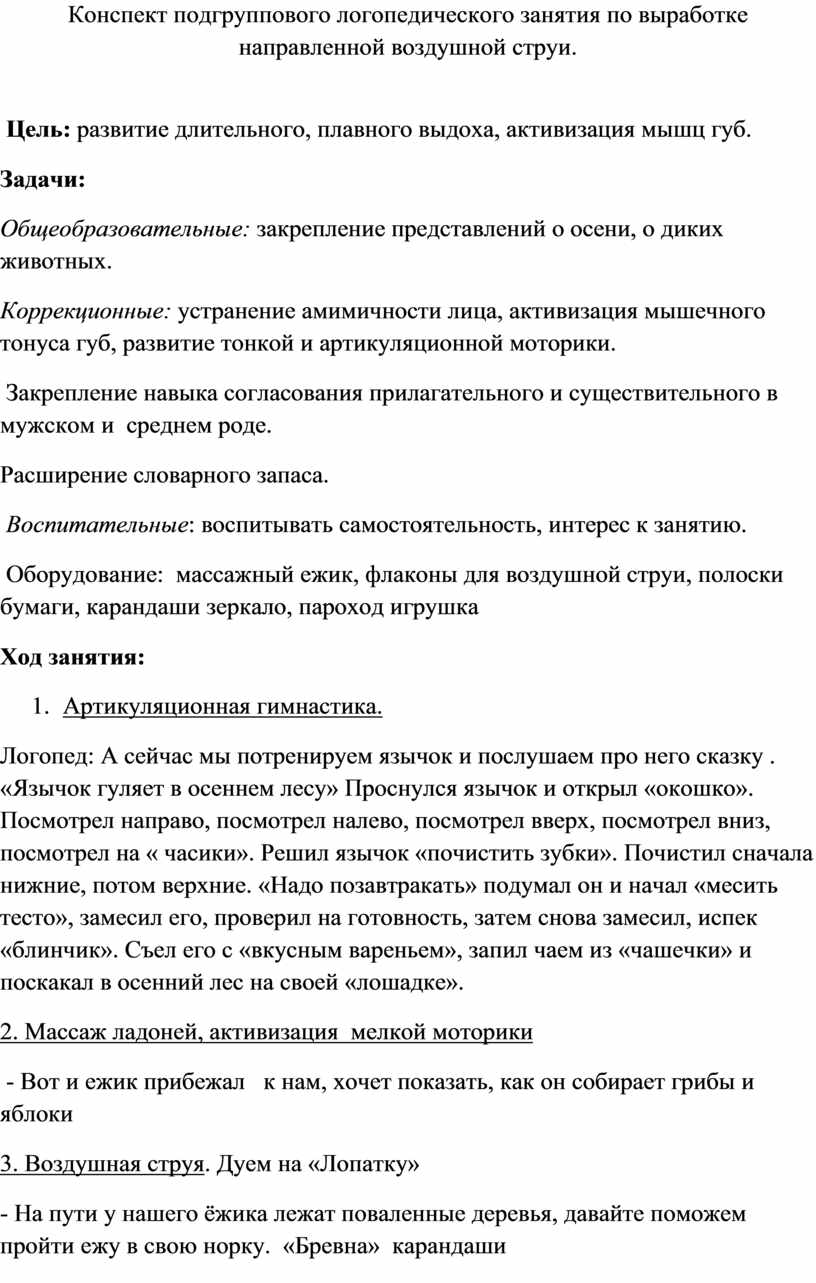 подгруппового логопедического занятия по выработке направленной воздушной струи.