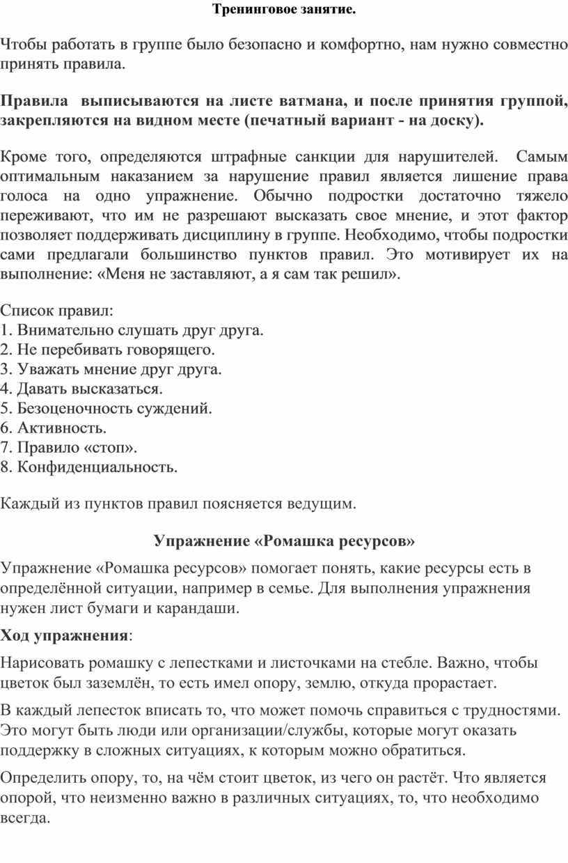 Кроме того, определяются штрафные санкции для нарушителей. Самым оптимальным наказанием за нарушение правил является лишение права голоса на одно упражнение. Обычно подростки достаточно тяжело переживают, что им не разрешают высказать свое мнение, и этот фактор позволяет поддерживать дисциплину в группе. Необходимо, чтобы подростки сами предлагали большинство пунктов правил. Это мотивирует их на выполнение: «Меня не заставляют, а я сам так решил».