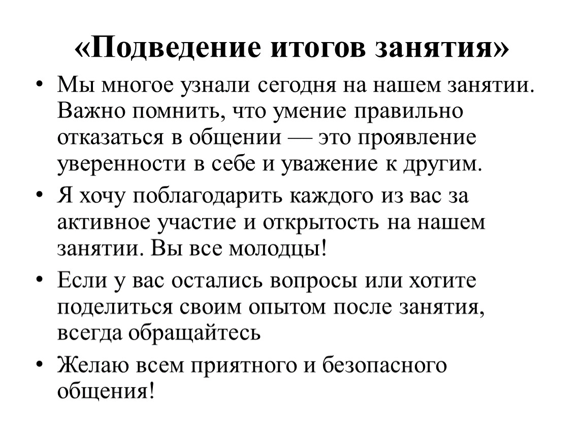 Мы многое узнали сегодня на нашем занятии. Важно помнить, что умение правильно отказаться в общении — это проявление уверенности в себе и уважение к другим.