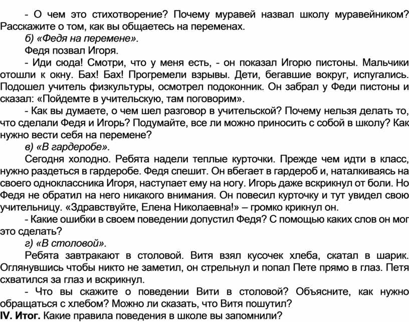IV. Итог. Какие правила поведения в школе вы запомнили?