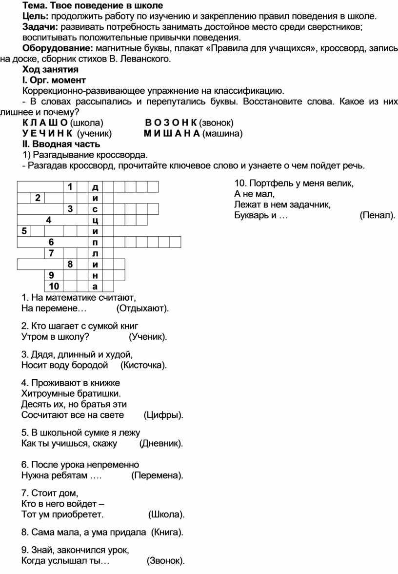 Оборудование: магнитные буквы, плакат «Правила для учащихся», кроссворд, запись на доске, сборник стихов В. Леванского.