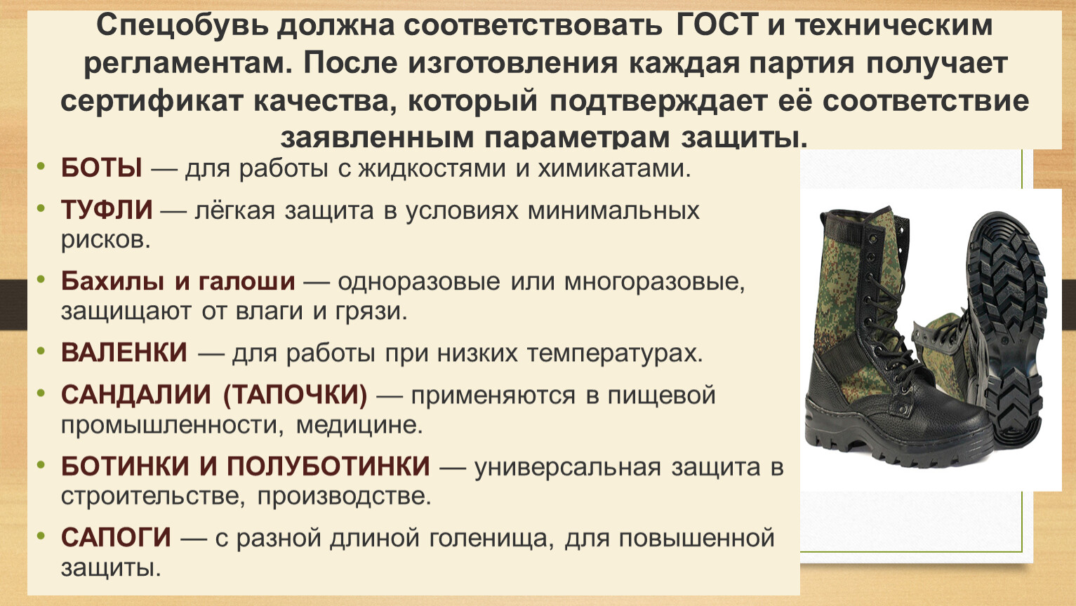 Спецобувь должна соответствовать ГОСТ и техническим регламентам. После изготовления каждая партия получает сертификат качества, который подтверждает её соответствие заявленным параметрам защиты.