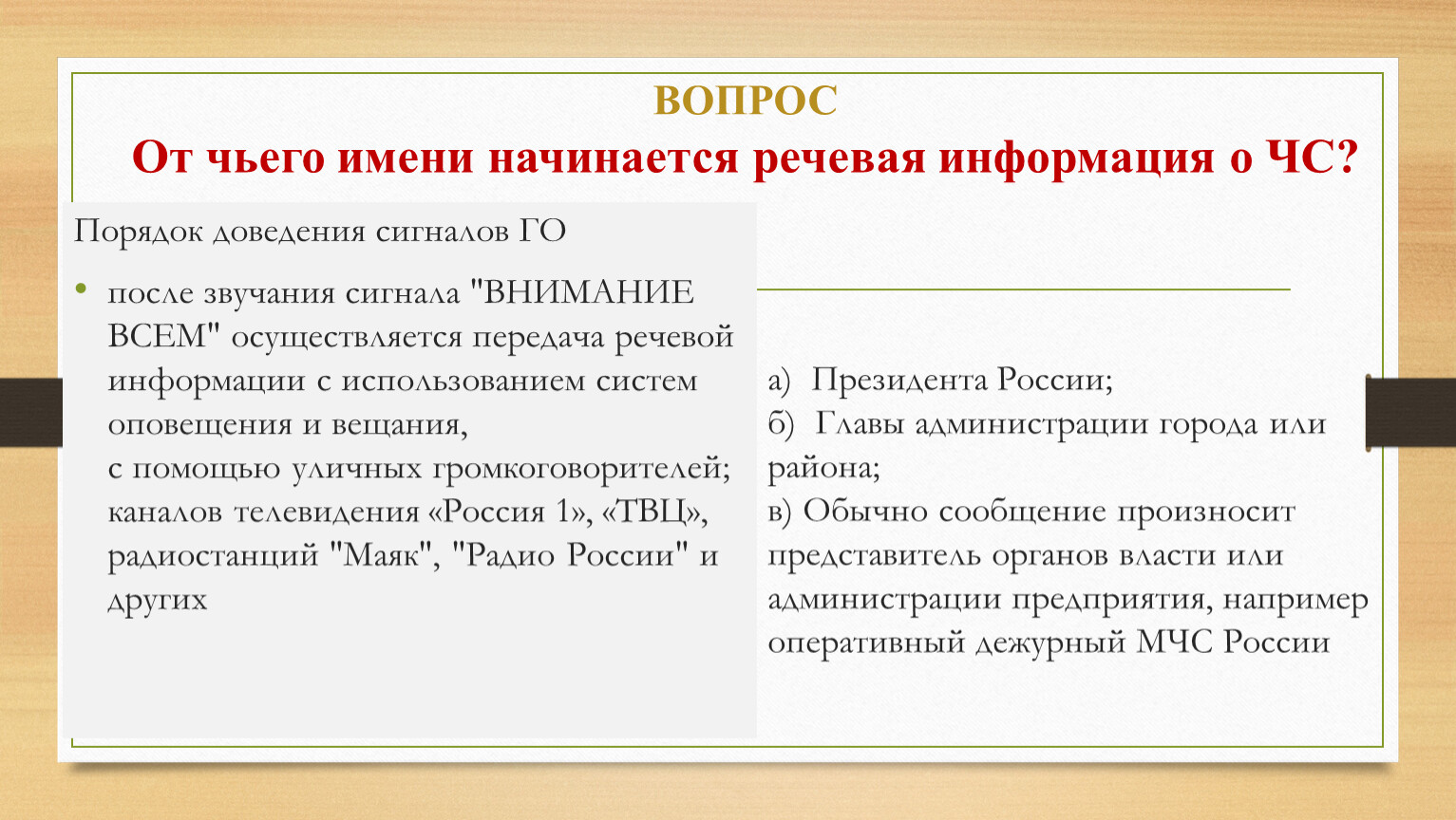 ВОПРОС От чьего имени начинается речевая информация о ЧС?