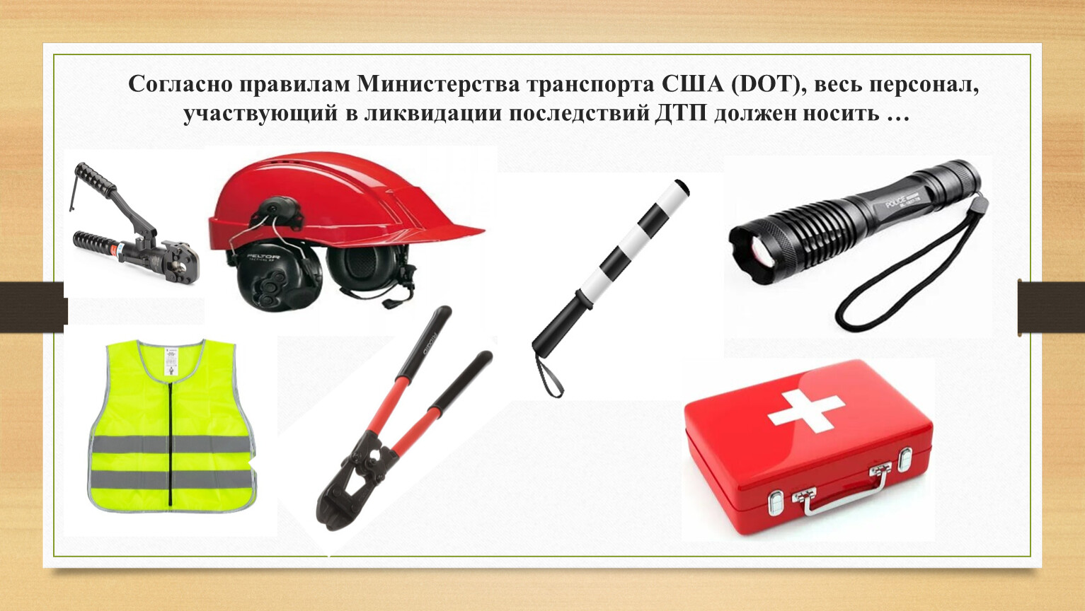 Согласно правилам Министерства транспорта США (DOT), весь персонал, участвующий в ликвидации последствий ДТП должен носить …