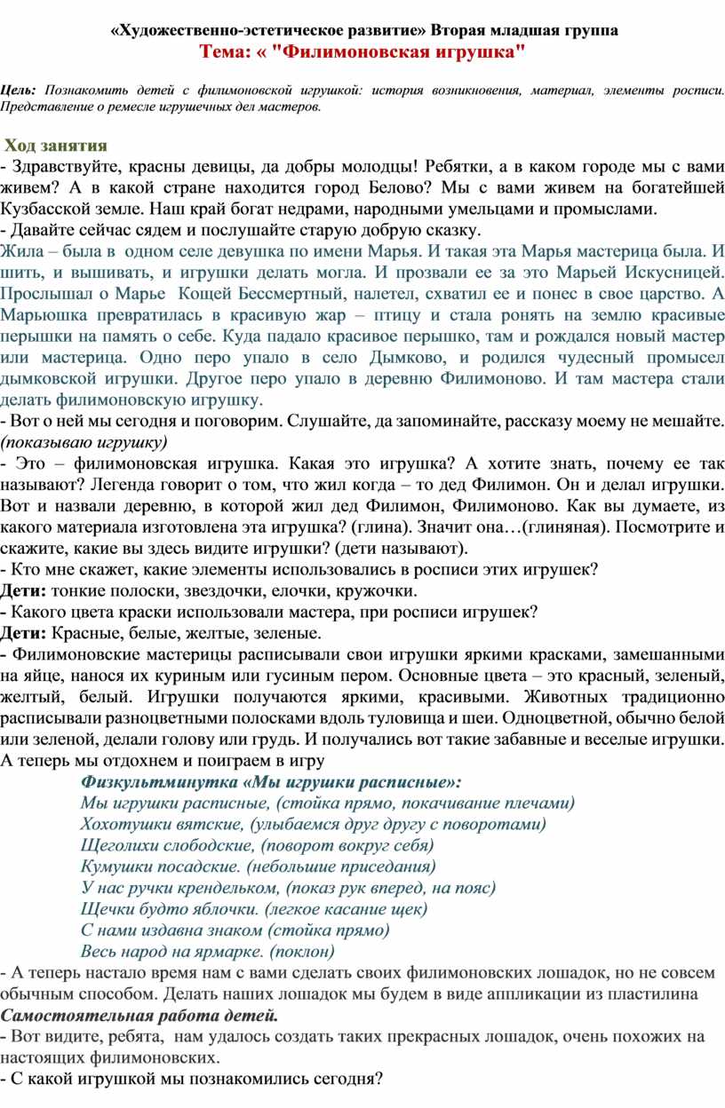 Цель: Познакомить детей с филимоновской игрушкой: история возникновения, материал, элементы росписи. Представление о ремесле игрушечных дел мастеров.
