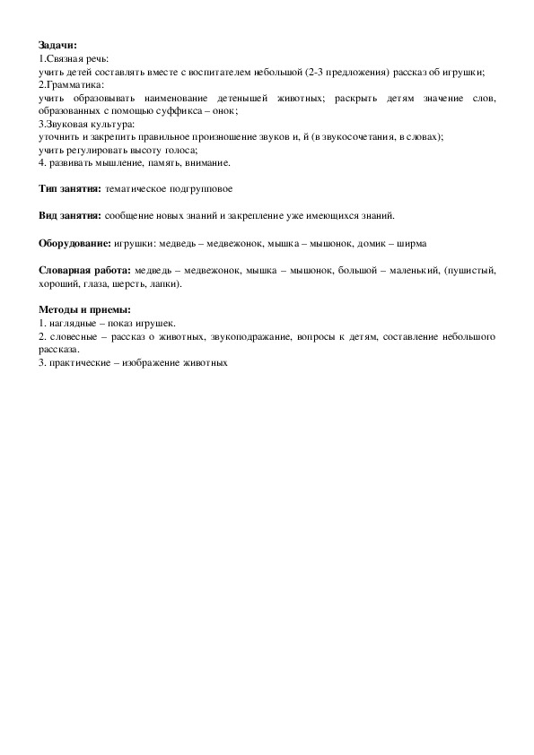 2. словесные – рассказ о животных, звукоподражание, вопросы к детям, составление небольшого