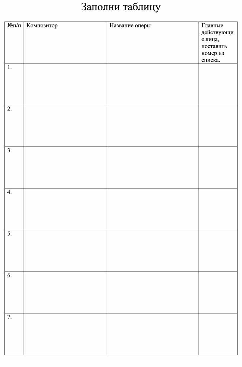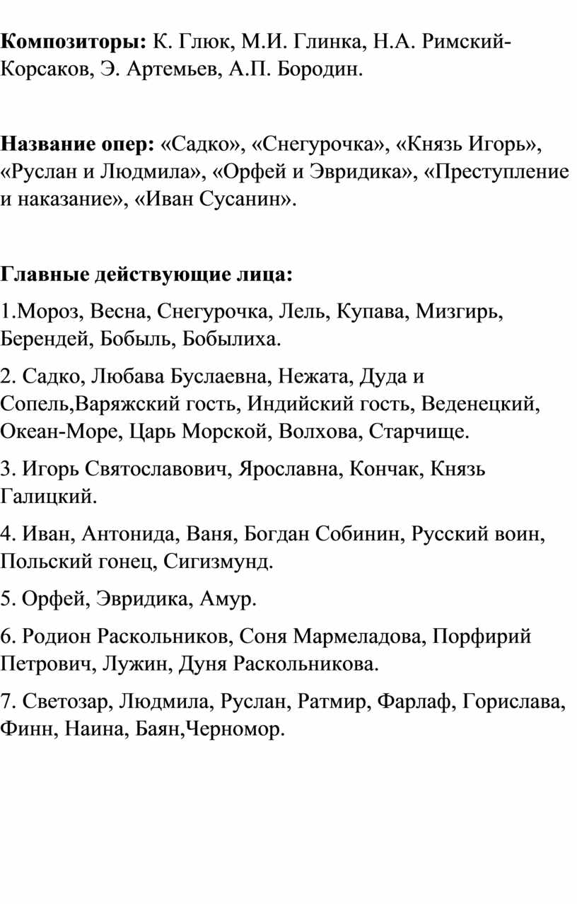 Название опер: «Садко», «Снегурочка», «Князь Игорь», «Руслан и Людмила», «Орфей и Эвридика», «Преступление и наказание», «Иван Сусанин».