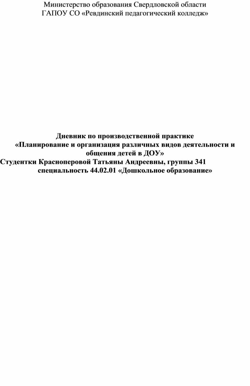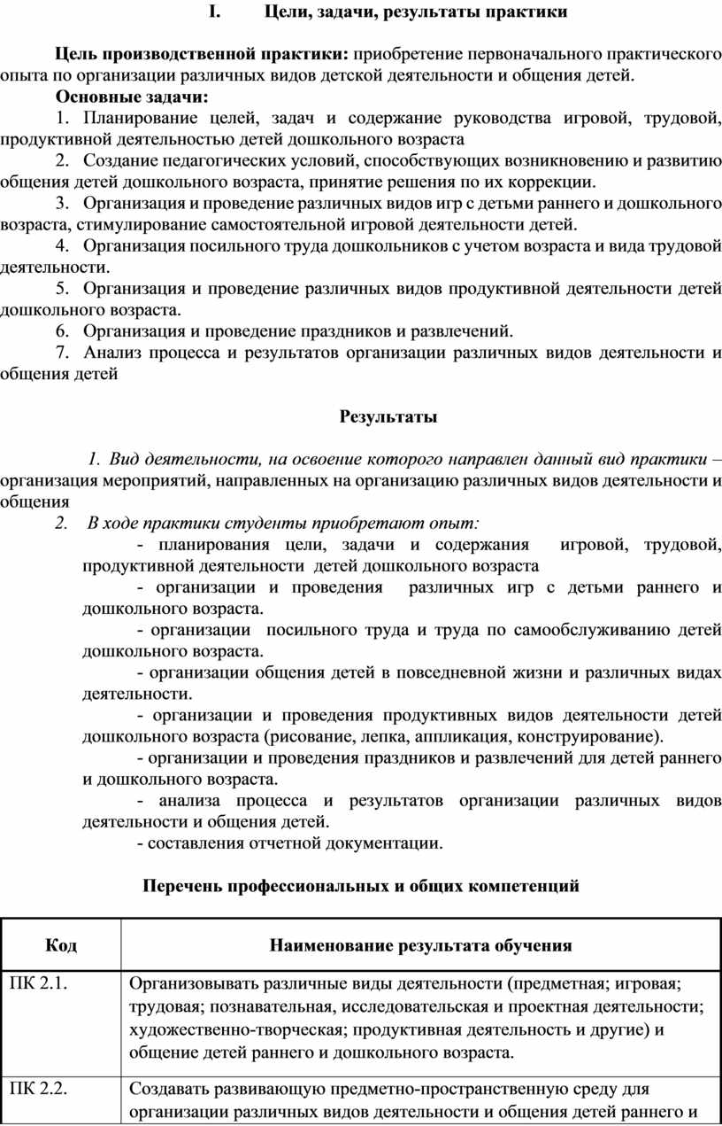 Цель производственной практики: приобретение первоначального практического опыта по организации различных видов детской деятельности и общения детей.