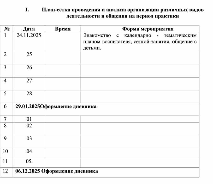 III. План-сетка проведения и анализа организации различных видов деятельности и общения на период практики