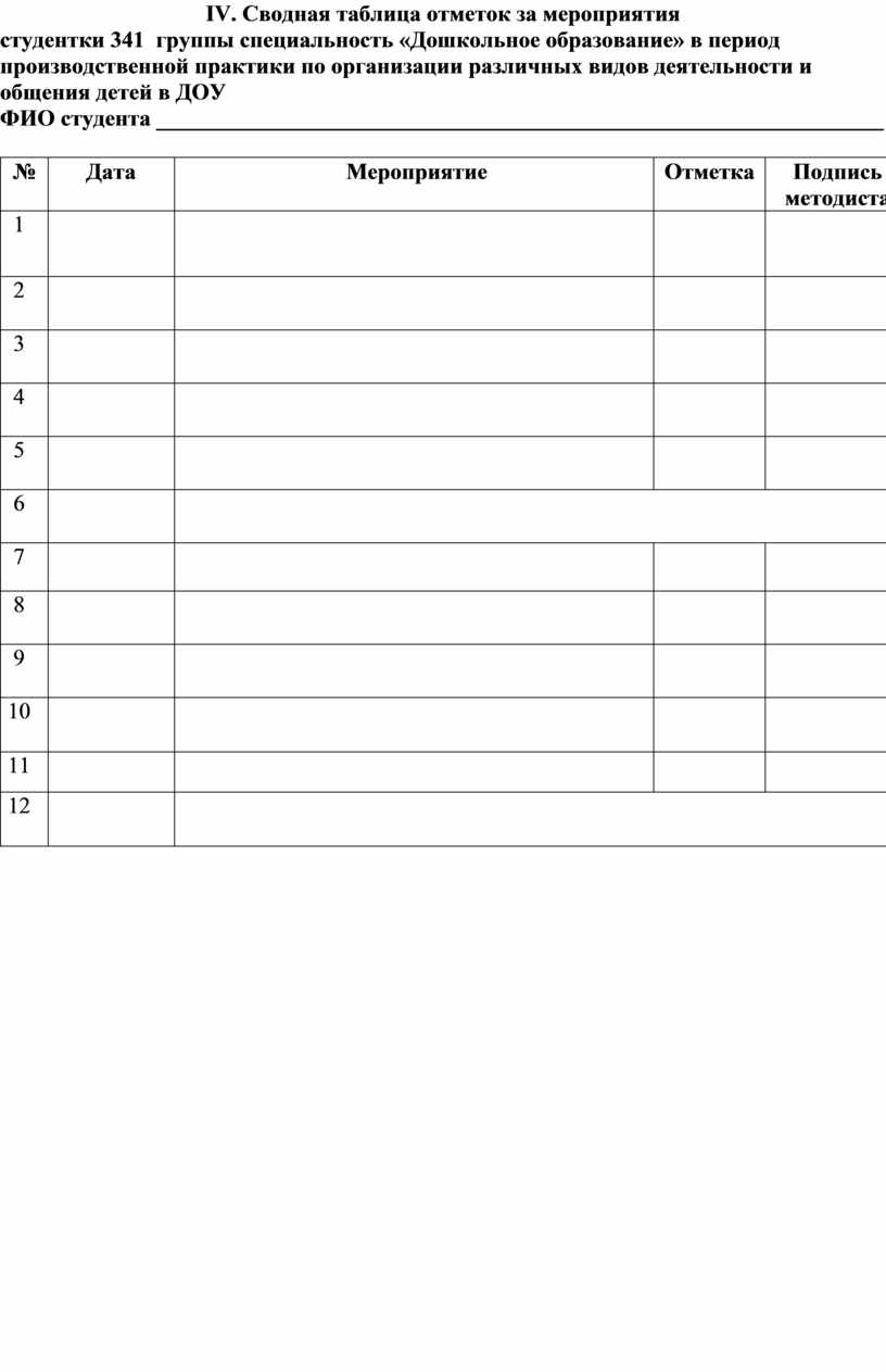 IV. Сводная таблица отметок за мероприятия