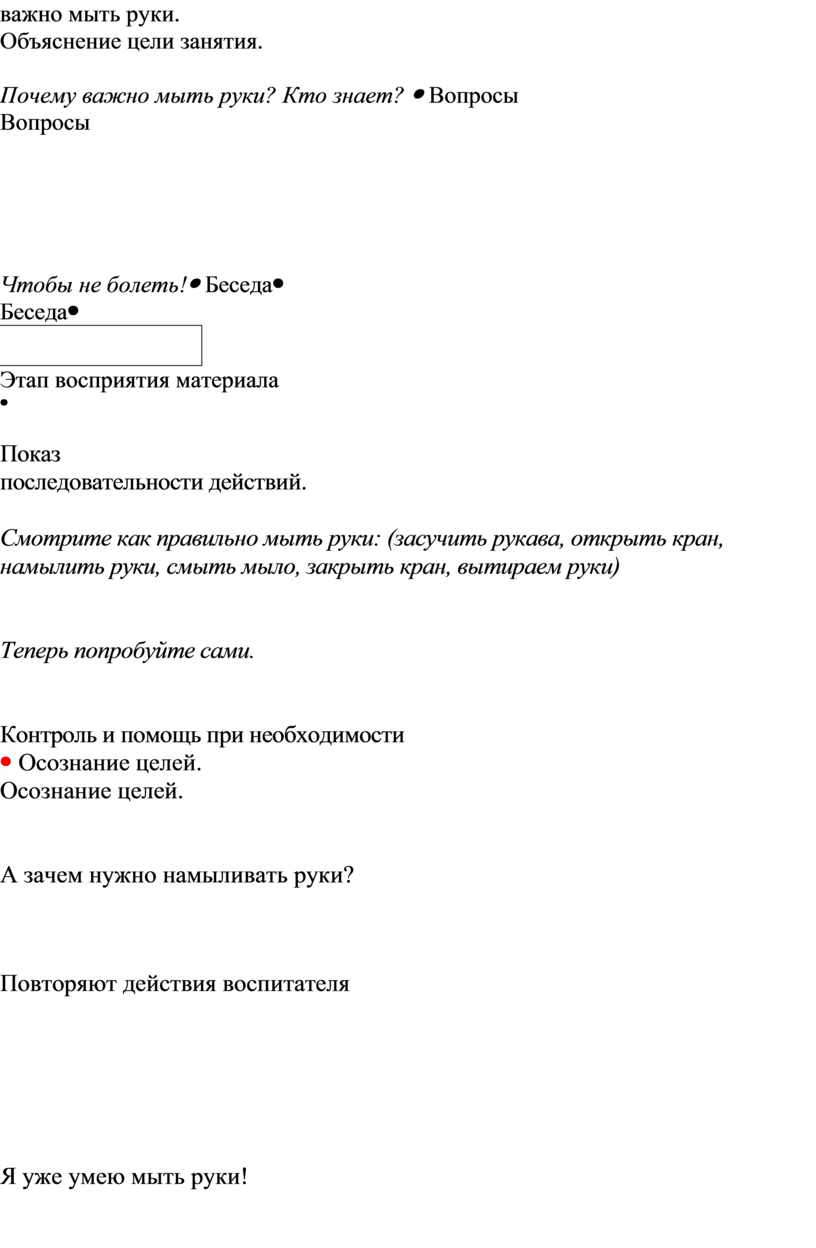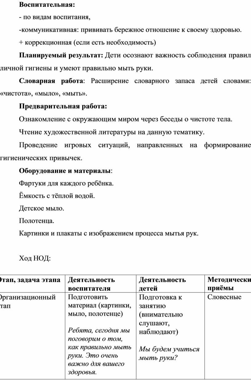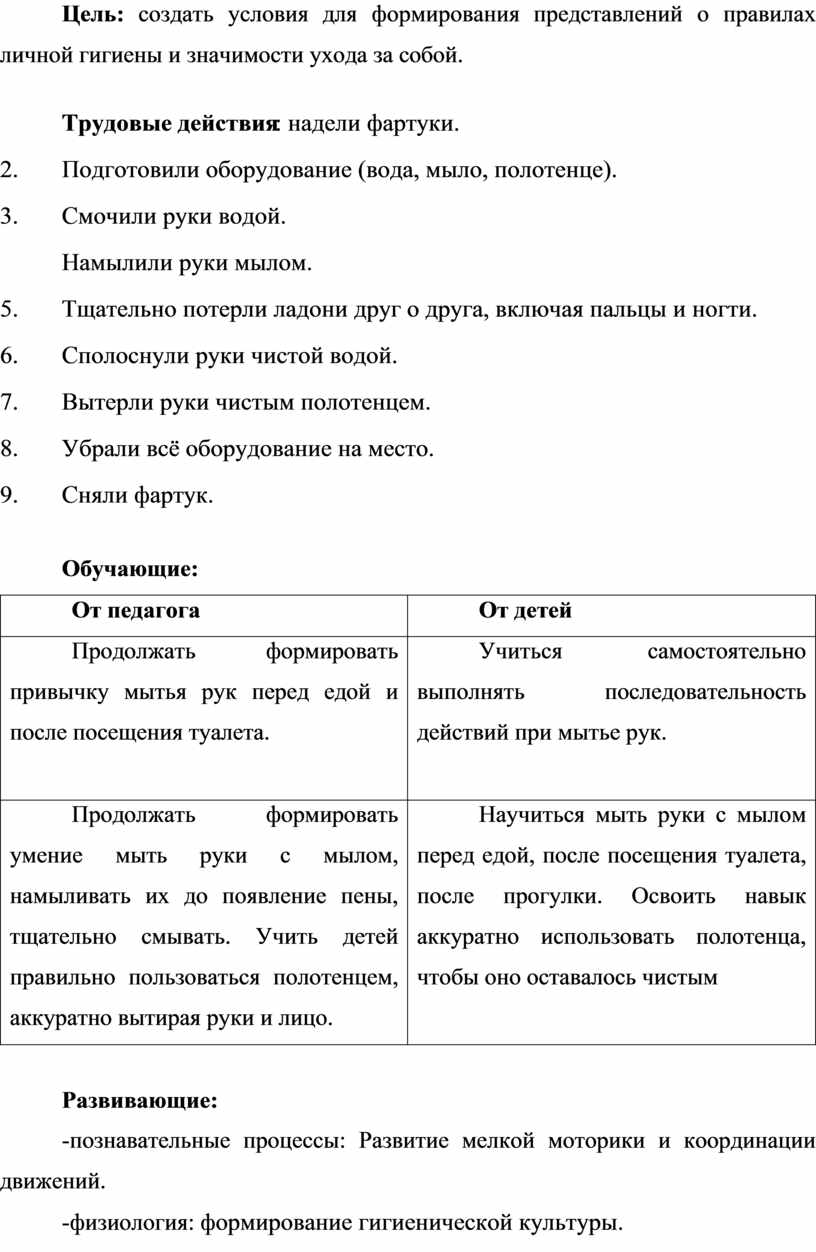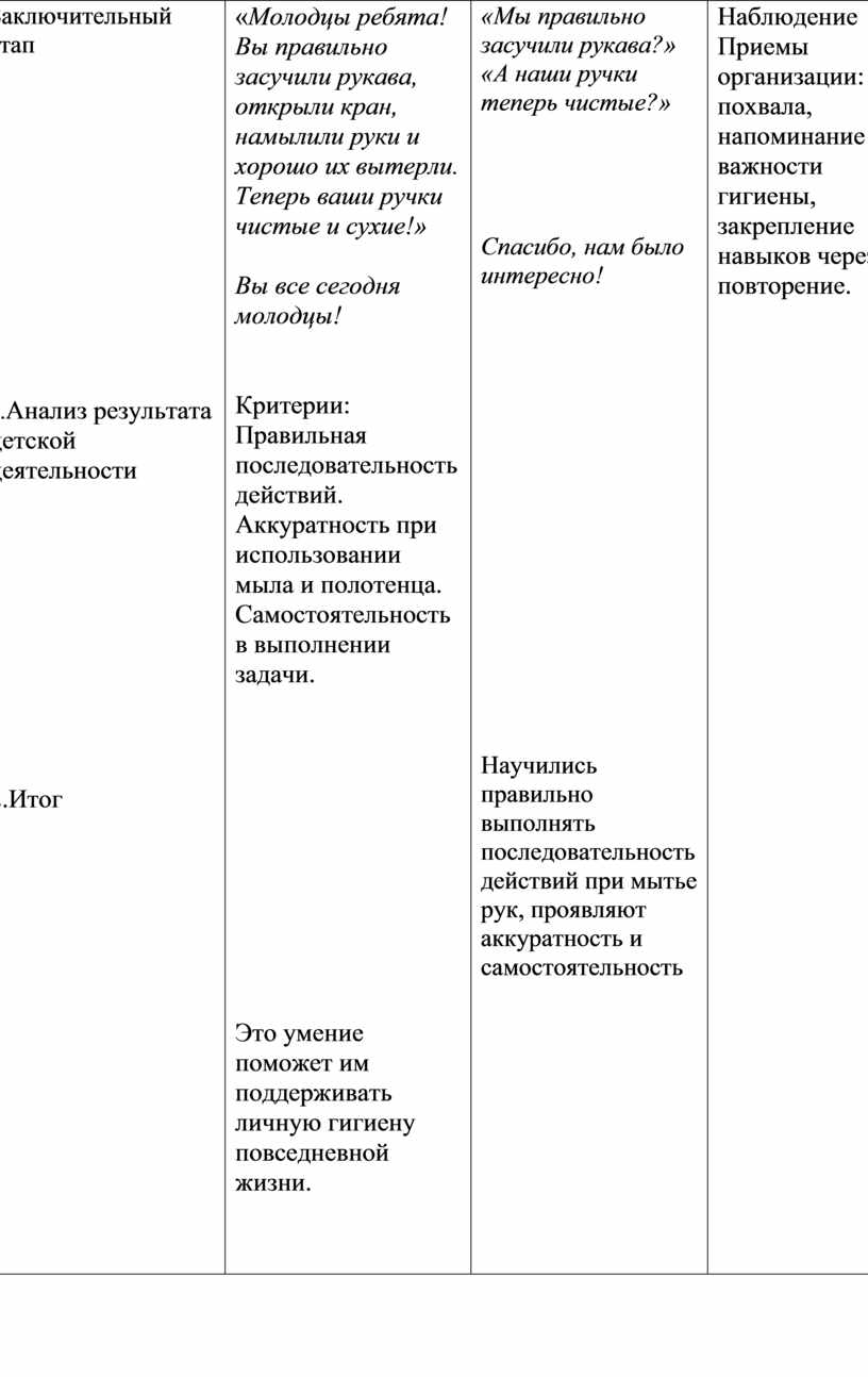 Наблюдение Приемы организации: похвала, напоминание о важности гигиены, закрепление навыков через повторение. |