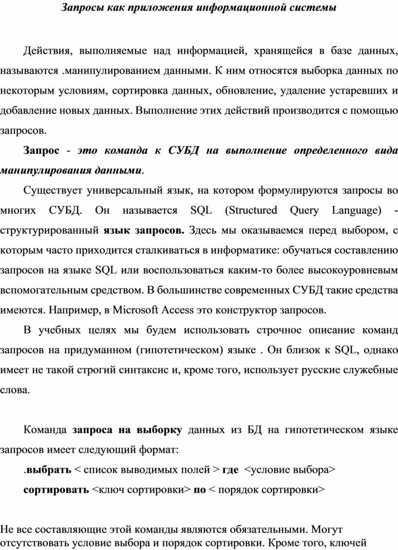 В учебных целях мы будем использовать строчное описание команд запросов на придуманном (гипотетическом) языке . Он близок к SQL, однако имеет не такой строгий синтаксис и, кроме того, использует русские служебные слова.
