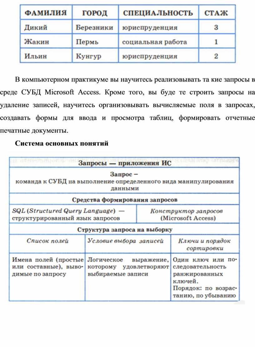 В компьютерном практикуме вы научитесь реализовывать та кие запросы в среде СУБД Microsoft Access. Кроме того, вы буде те строить запросы на удаление записей, научитесь организовывать вычисляемые поля в запросах, создавать формы для ввода и просмотра таблиц, формировать отчетные печатные документы.