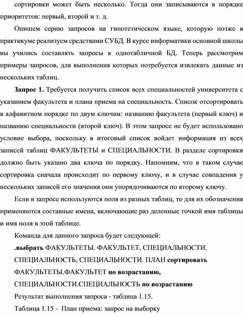 Запрос 1. Требуется получить список всех специальностей университета с указанием факультета и плана приема на специальность. Список отсортировать в алфавитном порядке по двум ключам: названию факультета (первый ключ) и названию специальности (второй ключ). В этом запросе не будет использовано условие выбора, поскольку в итоговый список войдет информация из всех записей таблиц ФАКУЛЬТЕТЫ и СПЕЦИАЛЬНОСТИ. В разделе сортировки должно быть указано два ключа по порядку. Напомним, что в таком случае сортировка сначала происходит по первому ключу, и в случае совпадения у нескольких записей его значения они упорядочиваются по второму ключу.