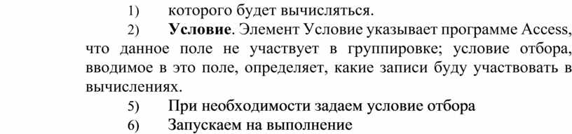 12) Условие. Элемент Условие указывает программе Access, что данное поле не участвует в группировке; условие отбора, вводимое в это поле, определяет, какие записи буду участвовать в вычислениях.