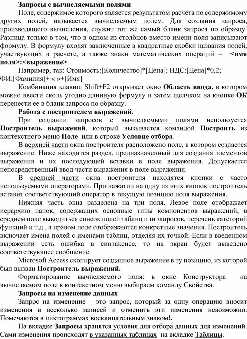 При создании запросов с вычисляемыми полями используется Построитель выражений, который вызывается командой Построить из контекстного меню Поле или в строке Условие отбора.