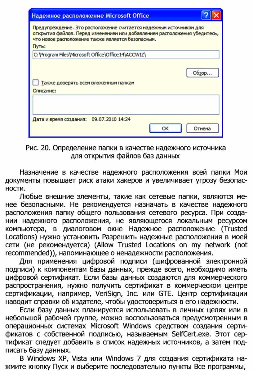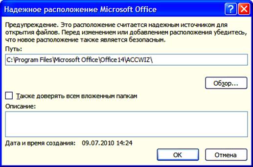 Рис. 20. Определение папки в качестве надежного источника для открытия файлов баз данных