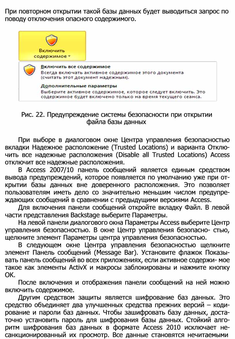 Если база данных не имеет состояния доверенной, программные средства центра управления безопасностью по умолчанию, не оценивая компоненты базы данных, отключает все выполняемое содержимое в базе данных и запрашивает у пользователя разрешение на его включе- ние, отображая панель сообщений «Защита баз данных» (рис. 21).