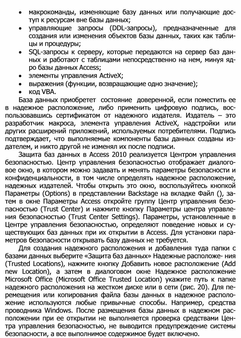 При открытии accdb- или accde-файла Access 2010 сообщает рас- положение базы данных центру управления безопасностью. Если это расположение надежное, она работает с полным набором функцио- нальных возможностей. При открытии базы данных из более ранней версии Access 2010 передает в Центр управления безопасностью рас- положение и цифровую подпись, если она имеется в базе данных.