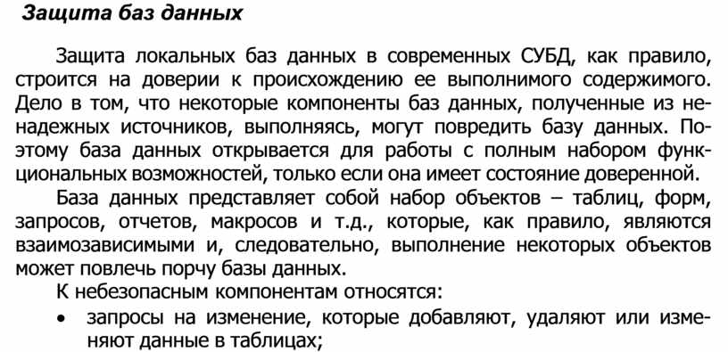 Защита локальных баз данных в современных СУБД, как правило, строится на доверии к происхождению ее выполнимого содержимого. Дело в том, что некоторые компоненты баз данных, полученные из не- надежных источников, выполняясь, могут повредить базу данных. По- этому база данных открывается для работы с полным набором функ- циональных возможностей, только если она имеет состояние доверенной.