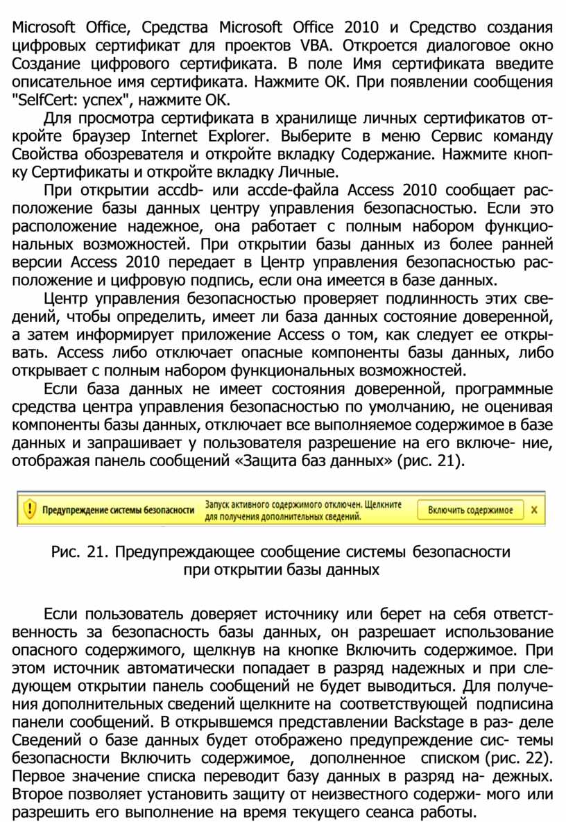 Рис. 21. Предупреждающее сообщение системы безопасности при открытии базы данных