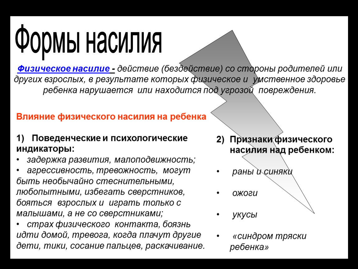Физическое насилие - действие (бездействие) со стороны родителей или других взрослых, в результате которых физическое и умственное здоровье ребенка нарушается или находится под угрозой повреждения.