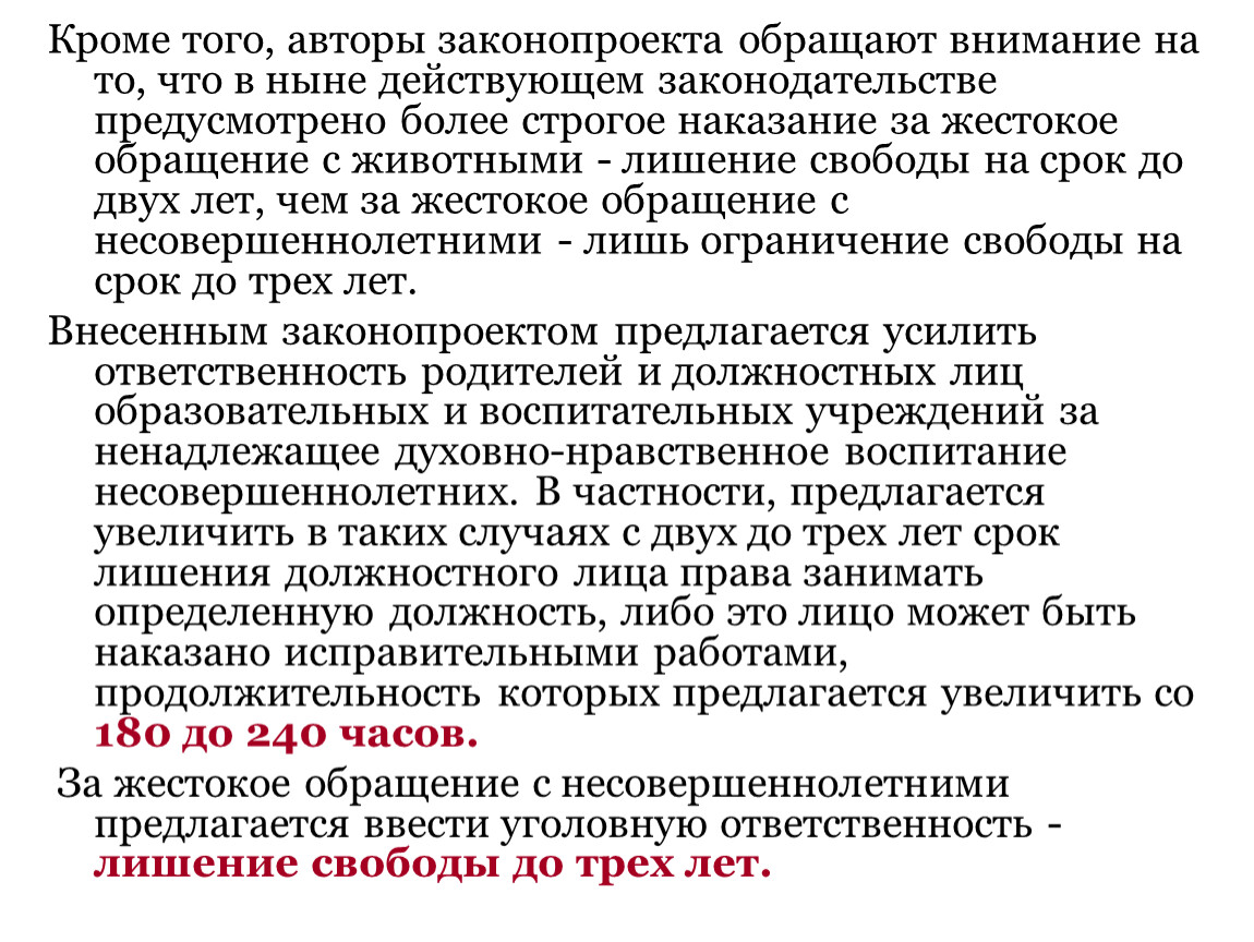 Кроме того, авторы законопроекта обращают внимание на то, что в ныне действующем законодательстве предусмотрено более строгое наказание за жестокое обращение с животными - лишение свободы на срок до двух лет, чем за жестокое обращение с несовершеннолетними - лишь ограничение свободы на срок до трех лет.