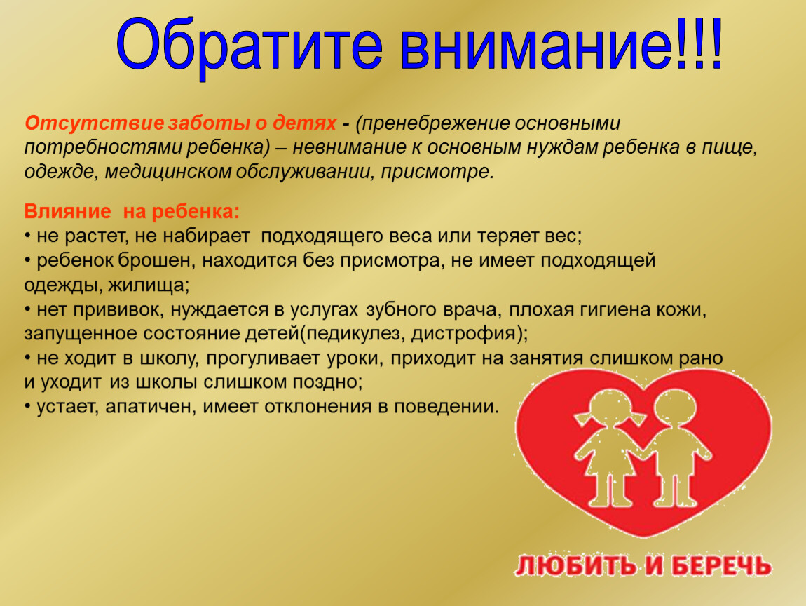 Отсутствие заботы о детях - (пренебрежение основными потребностями ребенка) – невнимание к основным нуждам ребенка в пище, одежде, медицинском обслуживании, присмотре.