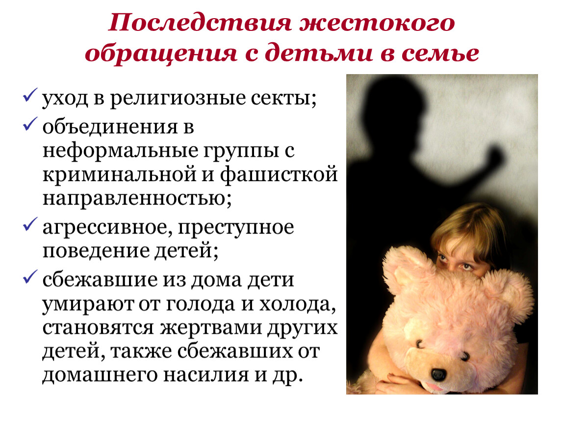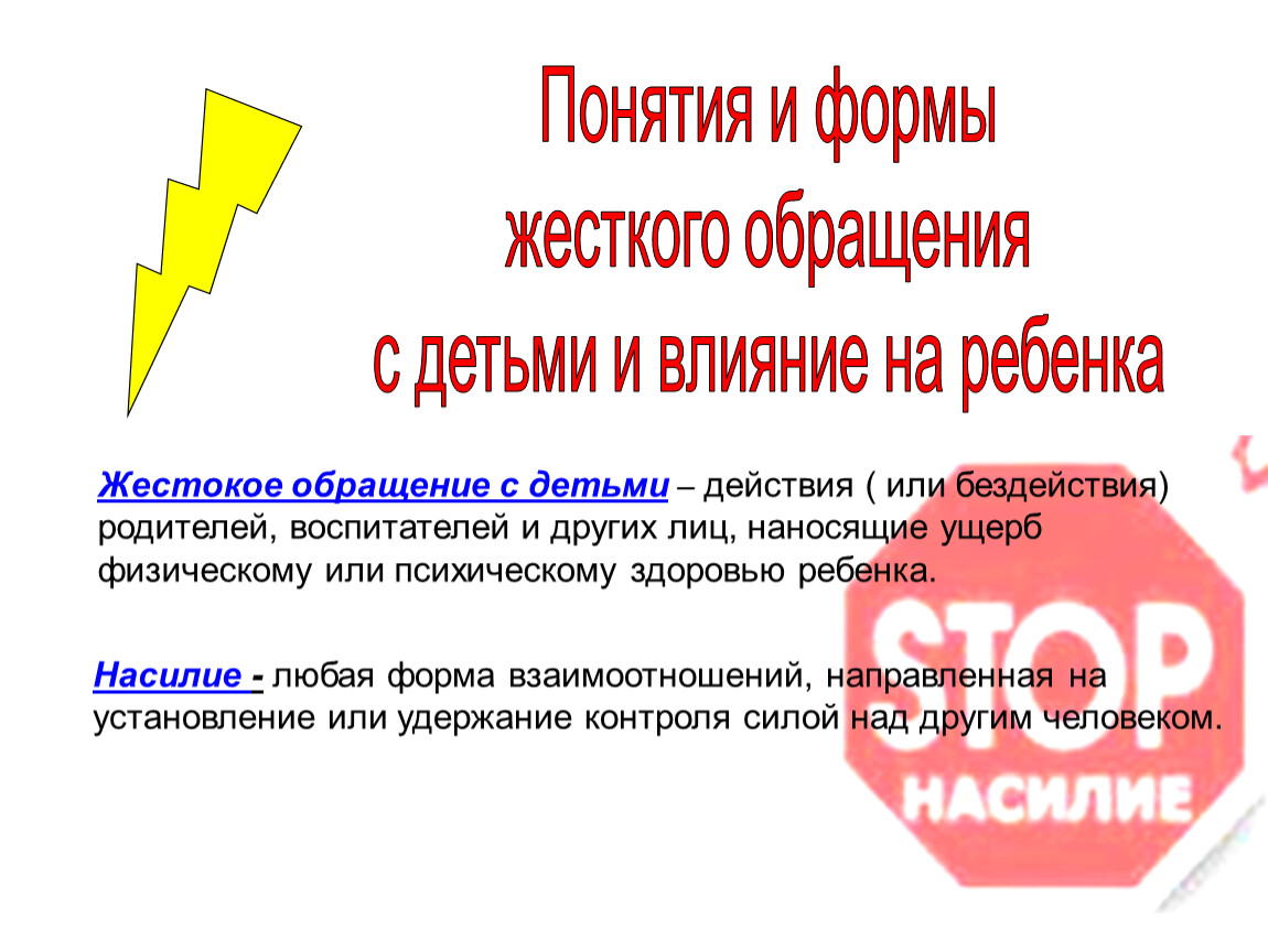 Жестокое обращение с детьми – действия ( или бездействия) родителей, воспитателей и других лиц, наносящие ущерб физическому или психическому здоровью ребенка.