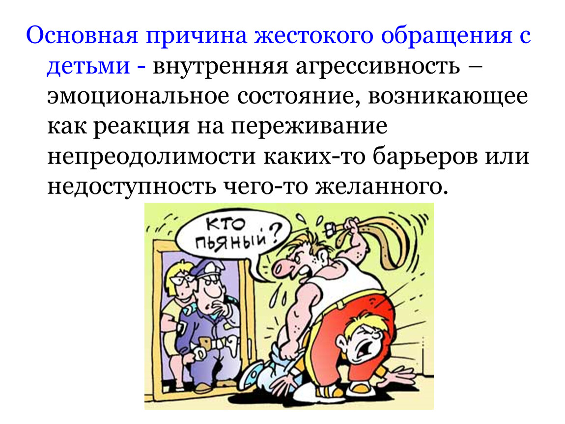Основная причина жестокого обращения с детьми - внутренняя агрессивность – эмоциональное состояние, возникающее как реакция на переживание непреодолимости каких-то барьеров или недоступность чего-то желанного.