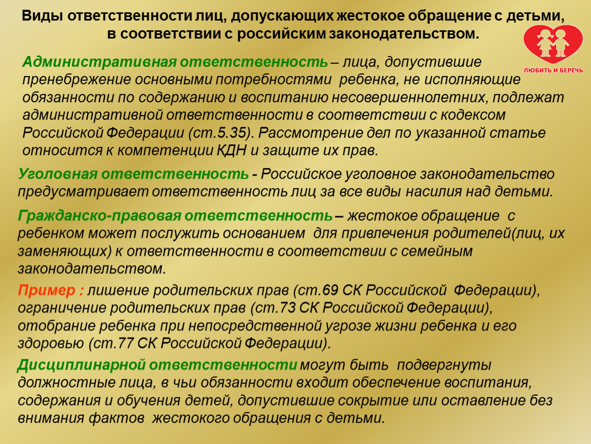 Виды ответственности лиц, допускающих жестокое обращение с детьми, в соответствии с российским законодательством.