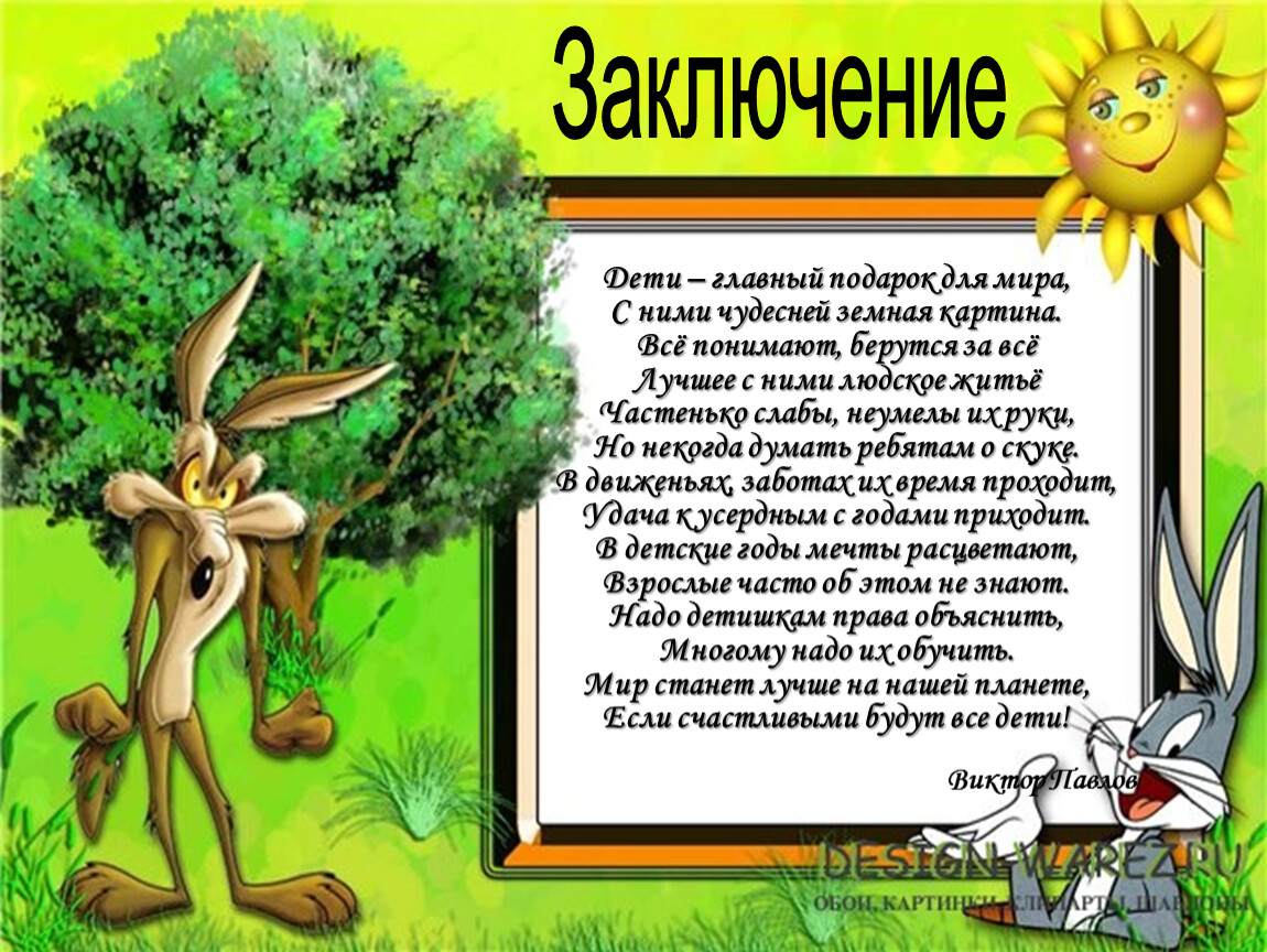 Дети – главный подарок для мира,С ними чудесней земная картина.Всё понимают, берутся за всёЛучшее с ними людское житьёЧастенько слабы, неумелы их руки,Но некогда думать ребятам о скуке.В движеньях, заботах их время проходит,Удача к усердным с годами приходит.В детские годы мечты расцветают,Взрослые часто об этом не знают.Надо детишкам права объяснить,Многому надо их обучить.Мир станет лучше на нашей планете,Если счастливыми будут все дети!