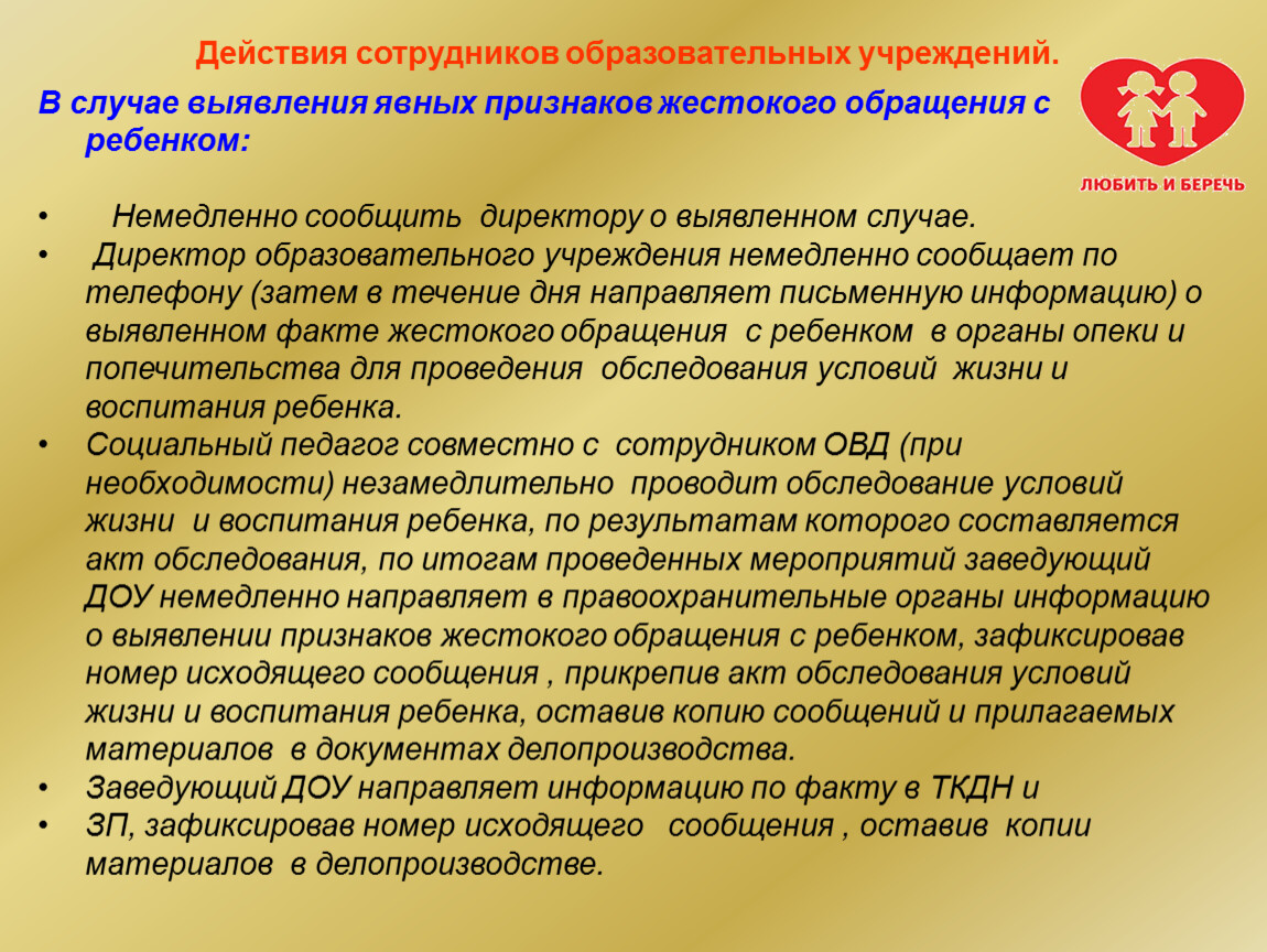 В случае выявления явных признаков жестокого обращения с ребенком: