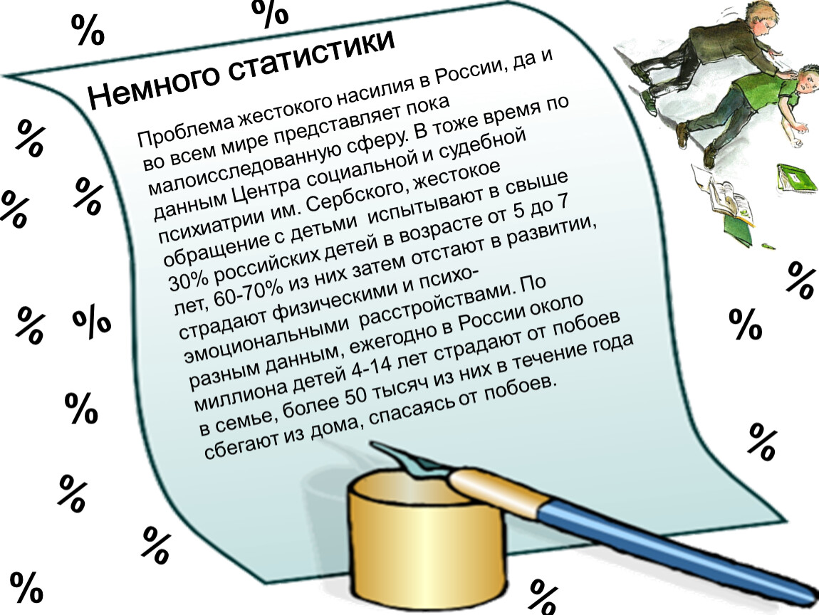 Проблема жестокого насилия в России, да и во всем мире представляет пока малоисследованную сферу. В тоже время по данным Центра социальной и судебной психиатрии им. Сербского, жестокое обращение с детьми испытывают в свыше 30% российских детей в возрасте от 5 до 7 лет, 60-70% из них затем отстают в развитии, страдают физическими и психо-эмоциональными расстройствами. По разным данным, ежегодно в России около миллиона детей 4-14 лет страдают от побоев в семье, более 50 тысяч из них в течение года сбегают из дома, спасаясь от побоев.