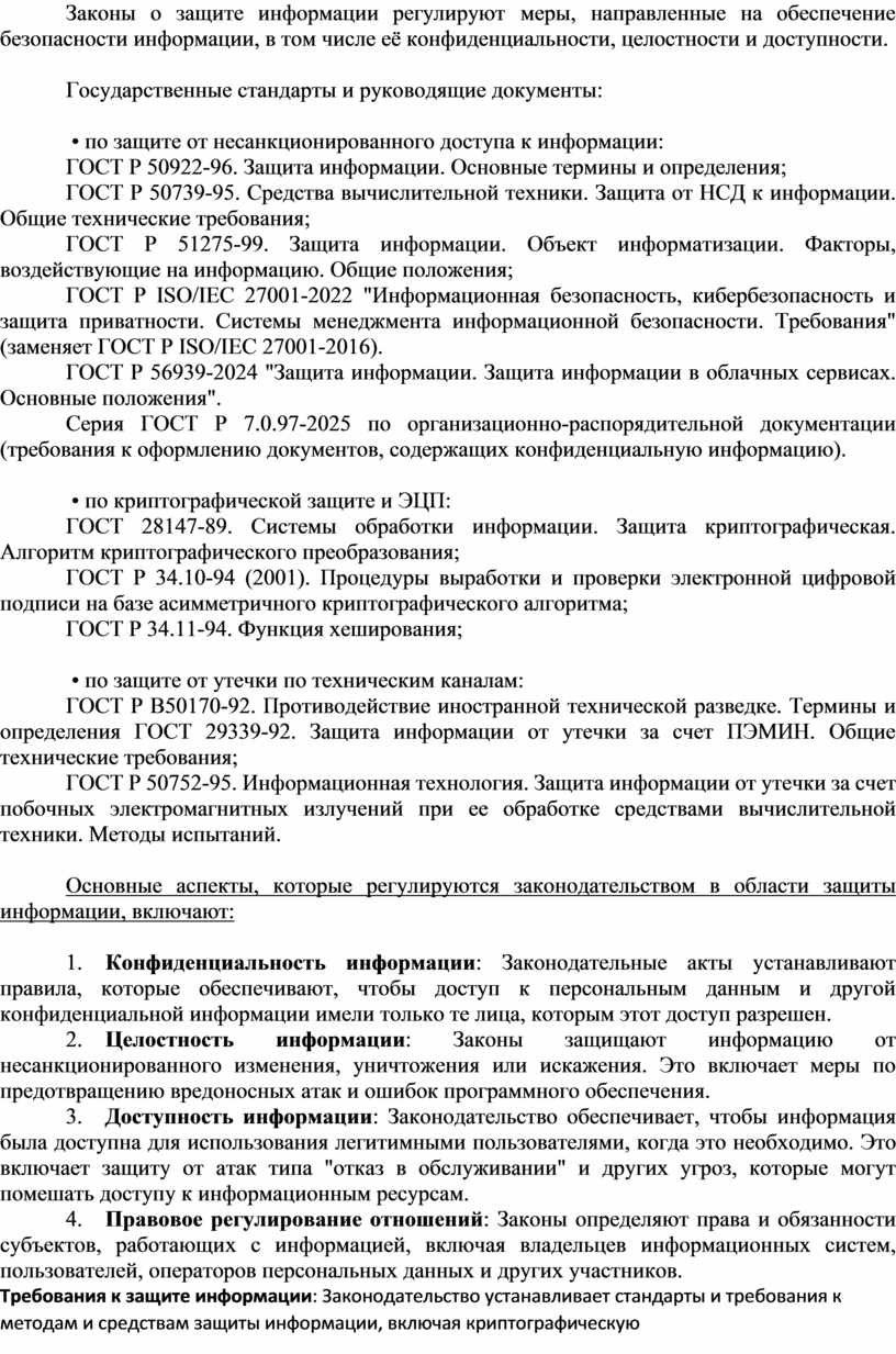 Основные аспекты, которые регулируются законодательством в области защиты информации, включают: