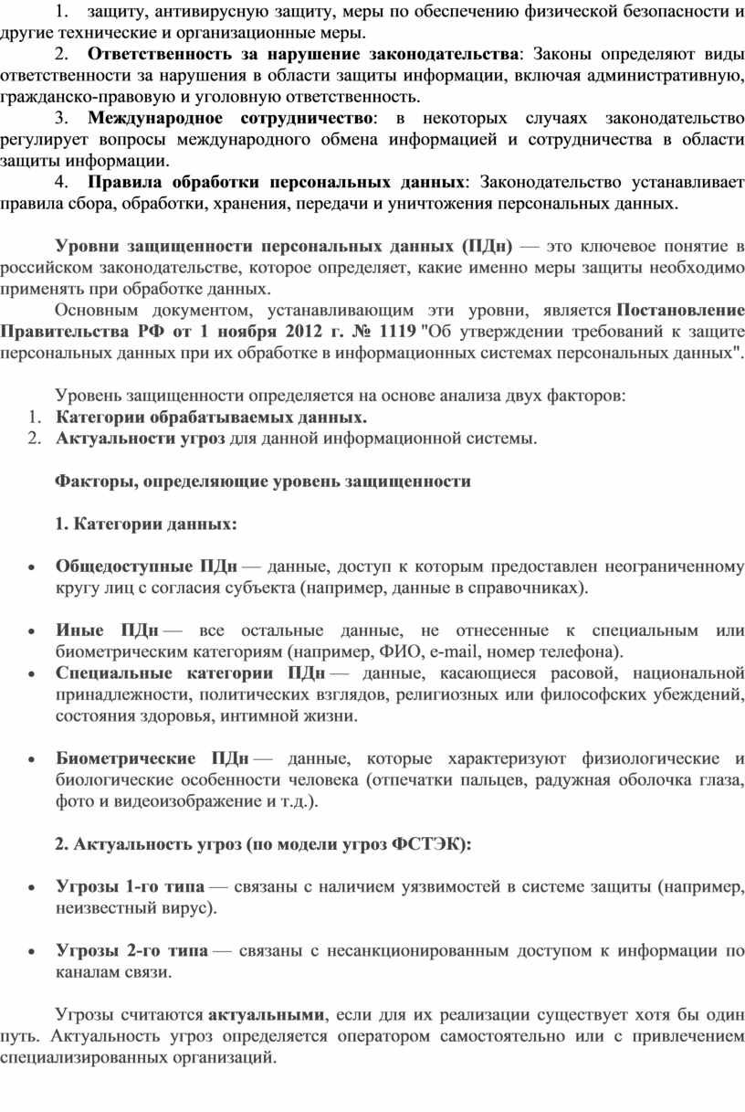 7. Международное сотрудничество: в некоторых случаях законодательство регулирует вопросы международного обмена информацией и сотрудничества в области защиты информации.