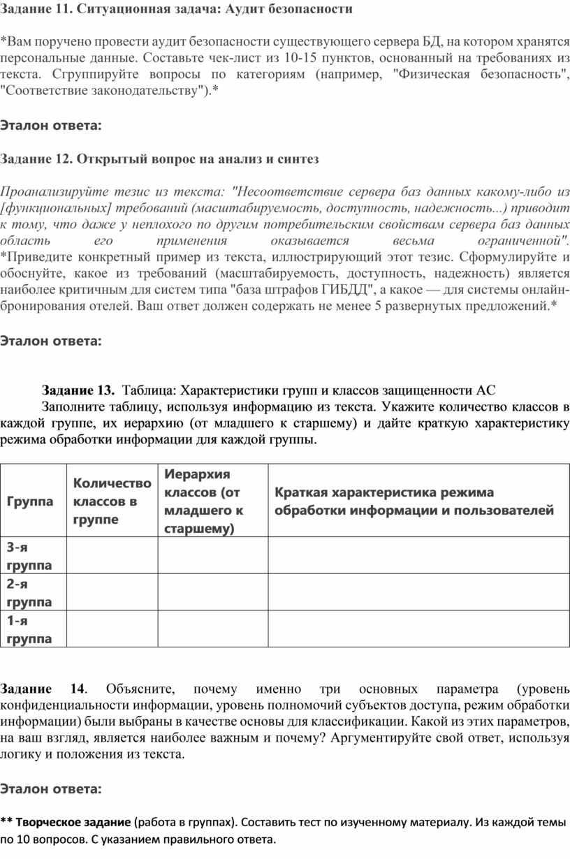 Задание 13. Таблица: Характеристики групп и классов защищенности АС