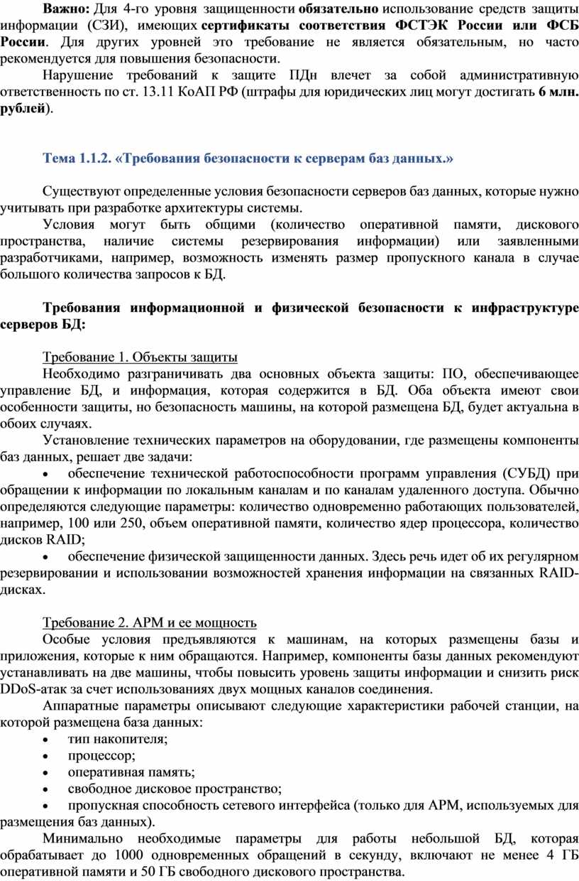 Лекция 1.1. Законодательство Российской Федерации в области защиты информации. Требования безопасности к серверам баз данных. Классы защиты