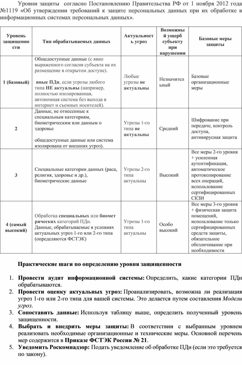 Уровни защиты согласно Постановлению Правительства РФ от 1 ноября 2012 года №1119 «Об утверждении требований к защите персональных данных при их обработке в информационных системах персональных данных».